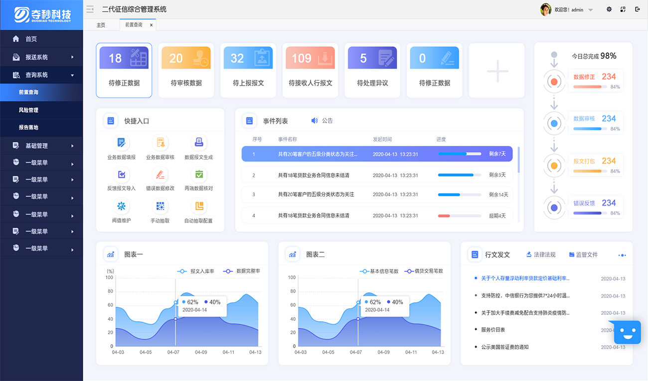 河北奪秒科技有限公司成立于2011年,注冊資金1200萬,是專注于金融信息化及軟硬件程序設計與開發(fā)的高科技軟件企業(yè)。專注于“監(jiān)管報送”,專業(yè)的事由專業(yè)的團隊來做!2020年1月17日至2020年5月3日期間(簡稱切換期),將一代征信系統所有業(yè)務分步切換至二代系統運行。2020年5月,二代征信系統全面接替一代征信系統。