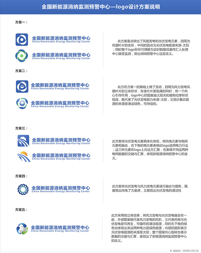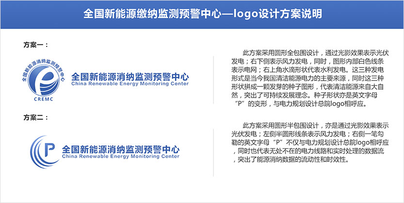 11月5日初次需求調(diào)研提出需求: 1.logo要體現(xiàn)中國(guó)電力規(guī)劃總院元素 2.顏色配比與電力規(guī)劃總院保持一致 3.突出風(fēng)電,光伏發(fā)電元素,電網(wǎng)元素和監(jiān)測(cè)動(dòng)態(tài)性 4.樣式設(shè)計(jì)要簡(jiǎn)潔,沉穩(wěn)大氣,體現(xiàn)專業(yè)性