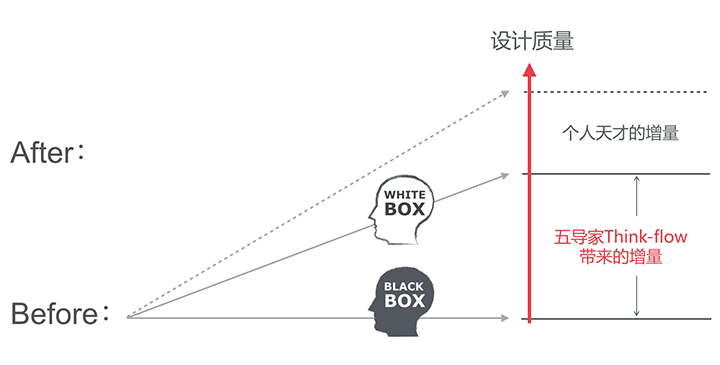 業務協同其實大家都不難理解,所有UED都在做這樣的事情,保質保量的完成業務需求,不斷迭代產品進度;設計增值就有一些難度了,首先要搞清楚如何論證設計的價值,才能說出增值有多少,所以針對這個問題我們打造了頁面數據統計工具,方便設計師、開發、運營、PD低成本的查看頁面上線后的數據反饋,及時了解設計的結果。設計師要做到增值,我們會推行《五導家》,常規來說,設計師一般接到設計需求就進入設計執行階段,中間思考過程是黑盒,即每次的設計都是發揮不同設計師個體價值,專業強的設計師輸出作品好一些,普通設計師輸出結果不穩定,UED團隊整體輸出品質不可預測,而《五導家》方法就是把設計過程的黑盒變成白盒的過程,是設計師常用方法抽象的5步過程,是設計工作的ThinkFlow。