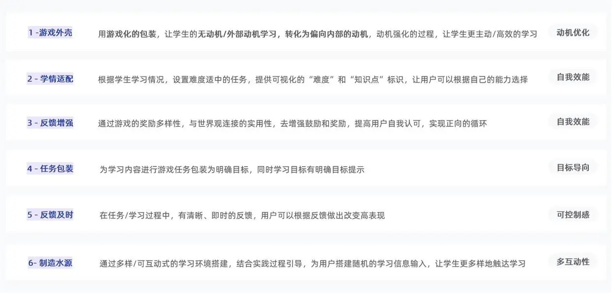 回顧上述內容,從教育軟件層面,游戲化設計的切入點可以歸納為如下內容。