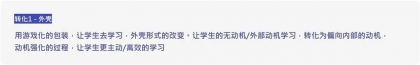 從這個理論來看,我們的第一個轉化是“外殼”。用游戲化的包裝,讓學生去學習,外殼形式的改變。讓學生的無動機/外部動機學習,轉化為偏向內部的動機,動機強化的過程,讓學生更主動/高效的學習。