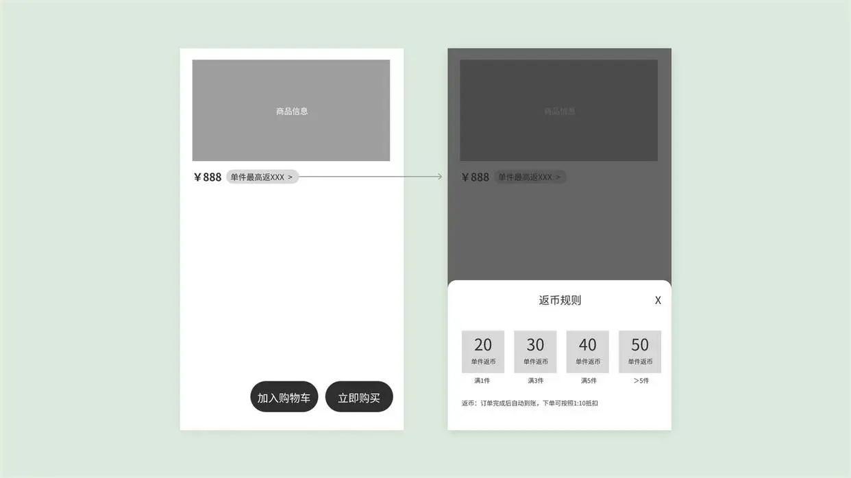 乍一看該功能都不需要設(shè)計(jì)師參與,只需要根據(jù)商品的返虛擬幣規(guī)則,將之前的單件反幣標(biāo)識(shí)改成多個(gè)就行,如“1 件返 XX、3 件返 XX…”,雖然看起來好像也解決了業(yè)務(wù)訴求,但是如果僅僅考慮標(biāo)識(shí)展示,而不結(jié)合需求背后的業(yè)務(wù)邏輯去思考,后續(xù)也會(huì)隨著規(guī)則的變化而帶來對(duì)應(yīng)的問題,那對(duì)于交互與UI設(shè)計(jì)師而言,針對(duì)這個(gè)需求,又該如何考慮的呢?我將分為“交互篇”與“UI篇”來分別闡述。