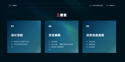 這里說的三要素分別為 設計目的、交互規則、完成任務過程。(三要素的定義說明都以簡單化的去舉例,主要展示整體的思維方法)