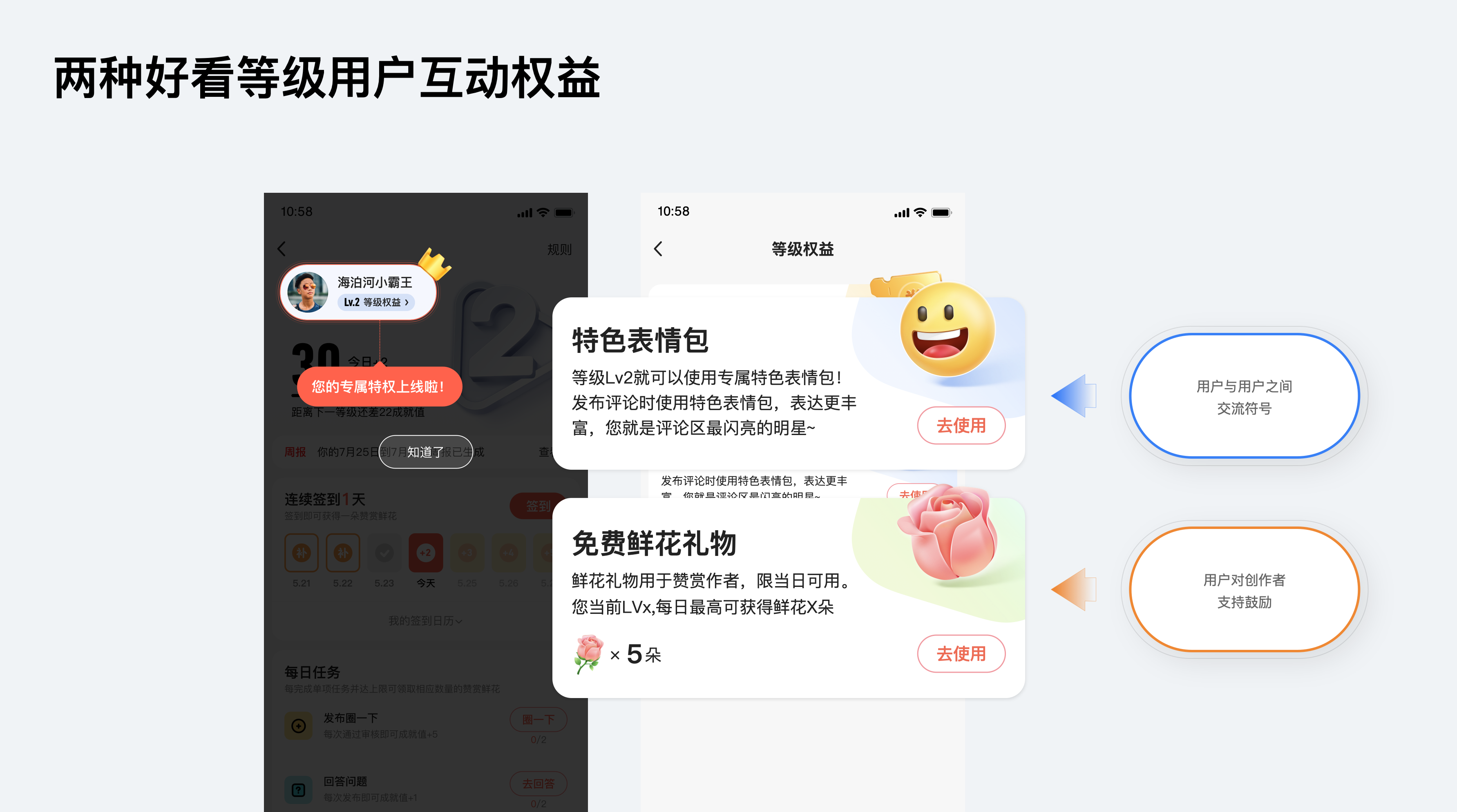 因此在精神激勵(lì)的虛擬權(quán)益上,好看平臺(tái)希望能夠打造一款有記憶點(diǎn)的互動(dòng)方式,一方面;用戶之間的主要互動(dòng)場景是評(píng)論區(qū),因此權(quán)益之一是打造符合好看人群特征的互動(dòng)表情,創(chuàng)造平臺(tái)特有的互動(dòng)語言來加強(qiáng)用戶交流;另一方面好看的內(nèi)容創(chuàng)作者一般為多平臺(tái)創(chuàng)作者,需要讓創(chuàng)作者在好看平臺(tái)上感受到用戶差異,激發(fā)創(chuàng)作動(dòng)力,因此也塑造了用戶等級(jí)下的另一個(gè)權(quán)益“鮮花禮物”。作者使用被打賞的鮮花可以進(jìn)行流量曝光的兌換,形成了一個(gè)用戶側(cè)互動(dòng)激勵(lì)與創(chuàng)作者側(cè)的良性互動(dòng)。