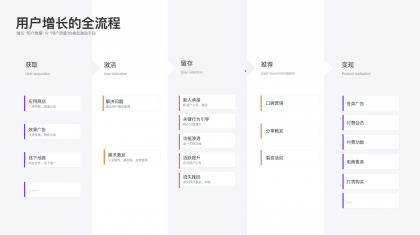 以上是用戶視角下的激勵(lì)體系,下面講講產(chǎn)品業(yè)務(wù)下的激勵(lì)體系的作用,通常情況下激勵(lì)體系伴隨著用戶增長的全流程“獲取—激活—留存—推薦—變現(xiàn)”各個(gè)過程。用戶增長代表著增長“用戶數(shù)量”與“用戶質(zhì)量”,以上三類激勵(lì)方式都會(huì)在產(chǎn)品增長的各流程中承擔(dān)著不同程度的促進(jìn)作用:
