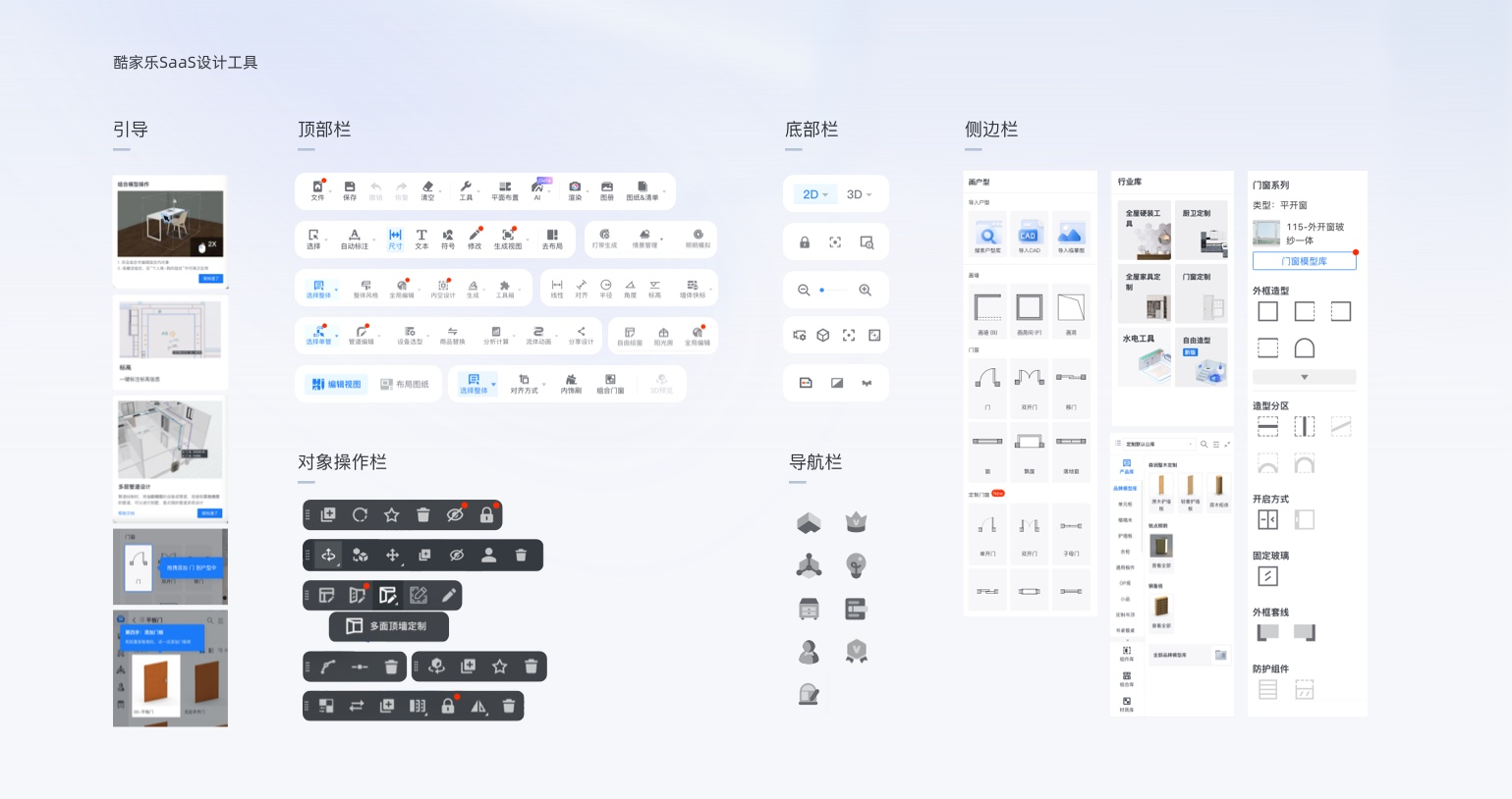 群核科技下產(chǎn)品正是這樣的特點,以酷家樂云設(shè)計工具為例,系統(tǒng)交互結(jié)合各行業(yè)垂類場景,各種命令、操作、引導(dǎo)、畫面控制等信息的表達(dá)很容易讓用戶疑惑。