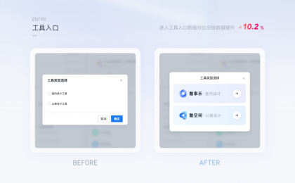 案例1:工具入口的圖形化表達(dá)用戶從工作臺進(jìn)入到設(shè)計工具,純文本的表達(dá)用戶很容易產(chǎn)生疑惑,在不改變業(yè)務(wù)邏輯的情況下,進(jìn)行圖形化表達(dá)。