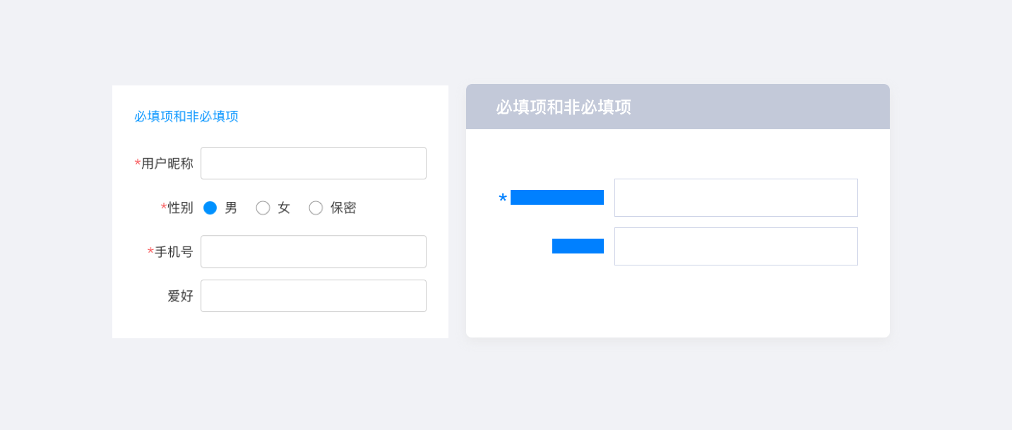 3.必填項指用戶必須要輸入的文本信息, 一般會用明確顏色凸顯, 非必填項一般是讓用戶選擇是否需要填寫。