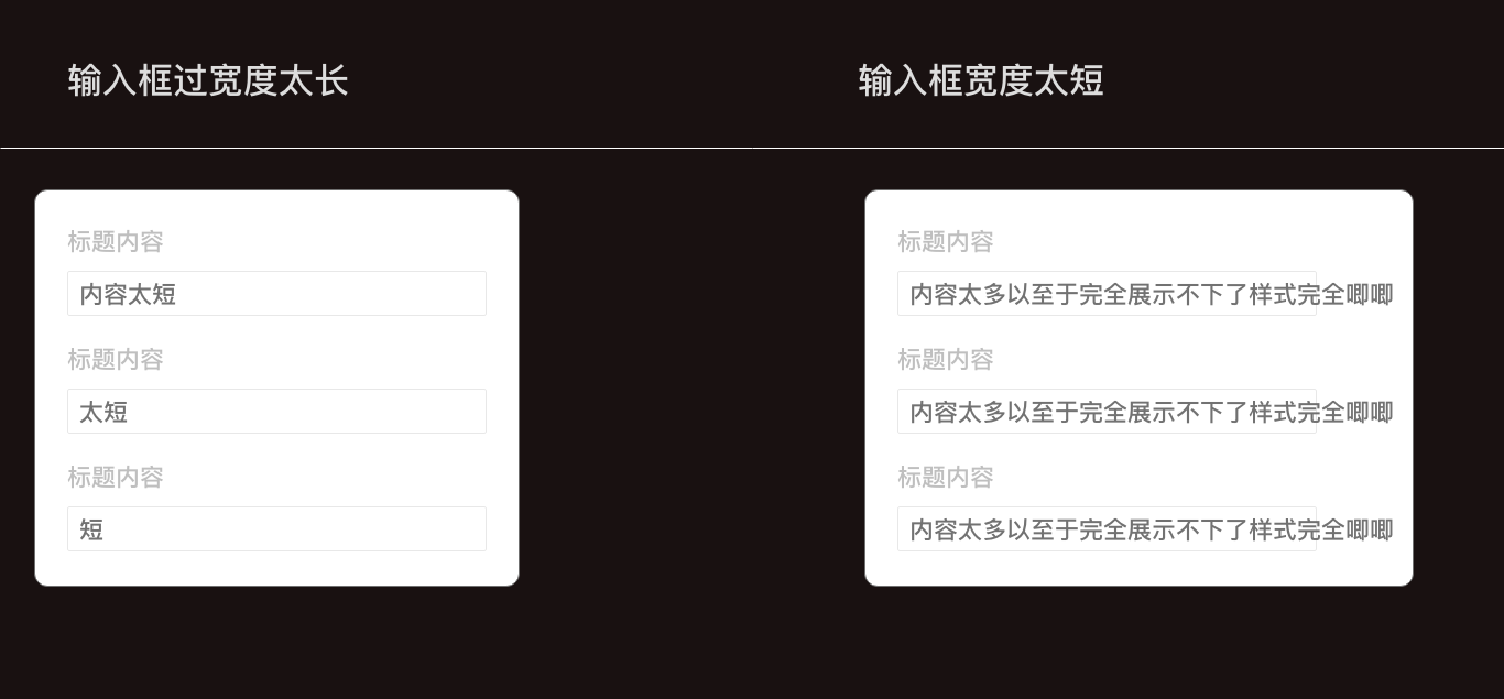 采用這樣的處理方式時,需要控制表單內輸入內容的長度高度一致,不然會面臨以下兩種尷尬:面對尷尬一(長度定太短)內容擴展性太差,無法同時滿足大段信息展示。面對尷尬一(長度定太長)輸入框當只填寫一兩個字符時,會很空視覺效果不佳。