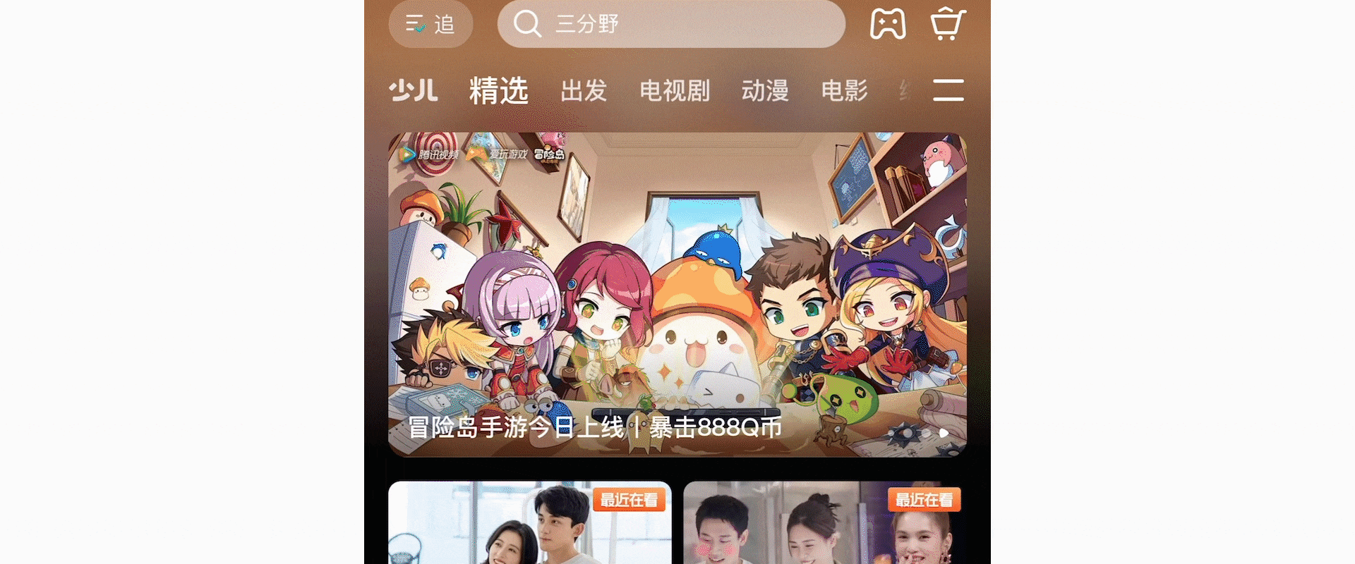 頂部操作區一般集合著大量的操作入口,主要功能如下:加追與預約:其中包含用戶添加的追劇列表、熱門預約、歷史觀看記錄等功能搜索:點擊進入搜索結果頁,其中包含熱門榜單、歷史記錄,用戶也可以快速搜索自己需要查找的視頻內容游戲中心:游戲中心主要是推廣騰訊自家的游戲內容,通過游戲中心對游戲進行引流與拉新周邊商城:周邊商城里面為視頻的周邊產品,用戶可以在周邊商城中進行商品購買