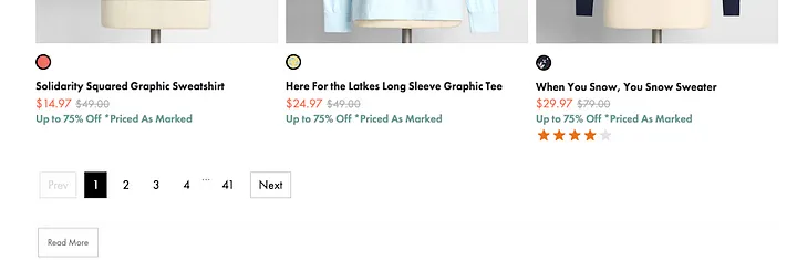 據我所知,無限流是由播客《Your Undivided Attention》的聯合主持人Aza Raskin發明的。他在2006年為一家名為“人性化”的用戶界面公司工作,那個時候人們還在使用“分頁”的設計,而他則想創建一種能夠取替分頁的方法。分頁是將內容切割成幾個頁面,通過底部的導航欄頁簽選擇可以跳轉的頁面,我們現在仍然能在一些電商網頁版中看到這種設計的蹤影,如下圖所示。