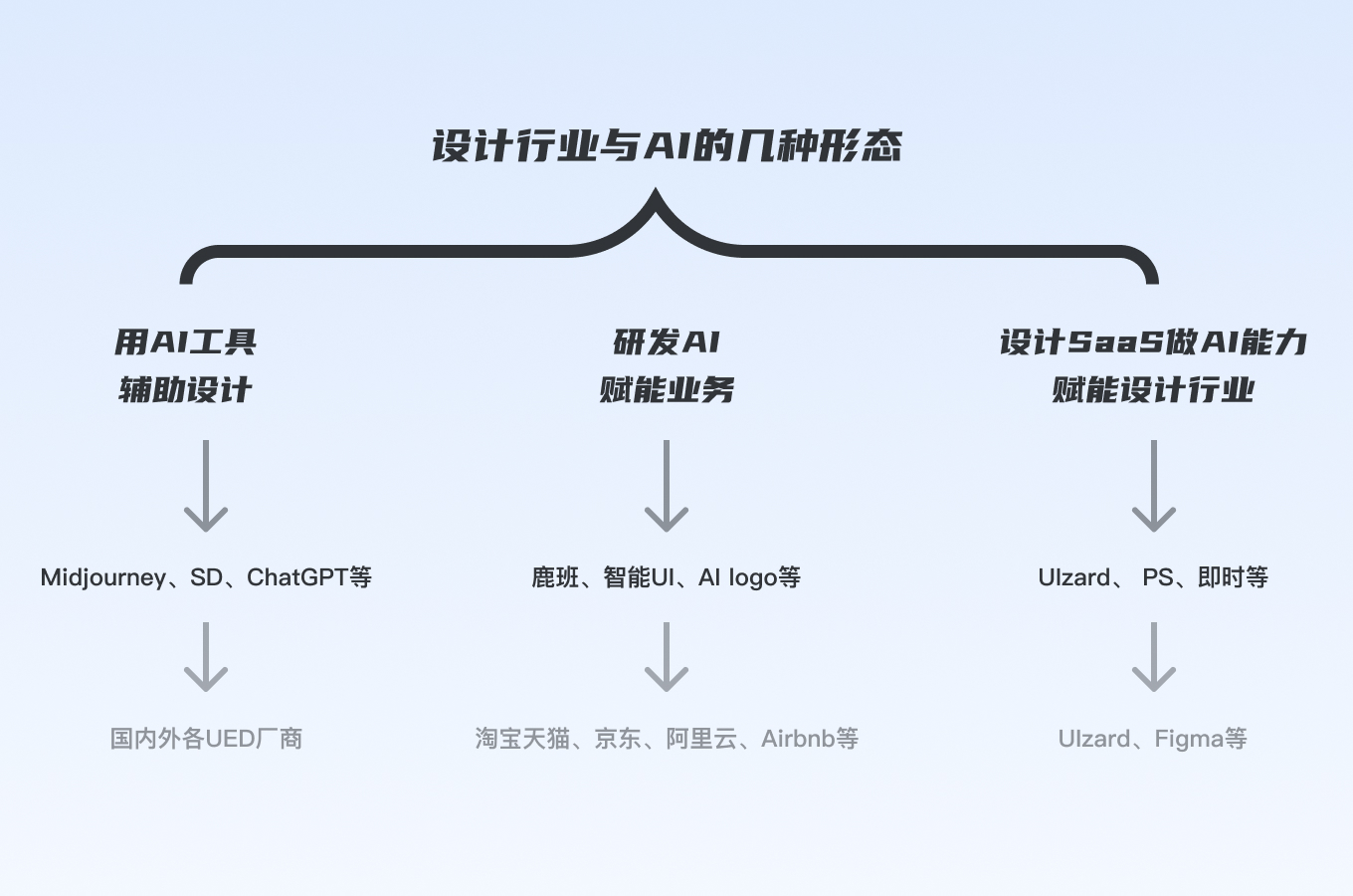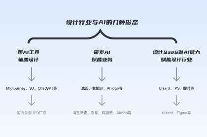 這里不涉及設計作為UI、UX接相關AI業務需求的場景,目前主要的關系是用AI工具輔助設計,設計驅動研發AI賦能業務在部分大廠有,非常稀缺,設計SaaS賦能行業總體來講玩家數量有限,這里不再贅述。