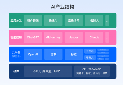 硬件、云平臺(模型層)、智能應用、應用分發構成了AI整個產業鏈條,站在產業格局的角度看,算力很重要、硬件卻并非關鍵。這輪變革最大的機會在應用層面,所以大量涌現出智能應用,比如ChatGPT、Midjourney;以及各行各業基于大模型對AI能力接入,提升自己產品力或服務能力。