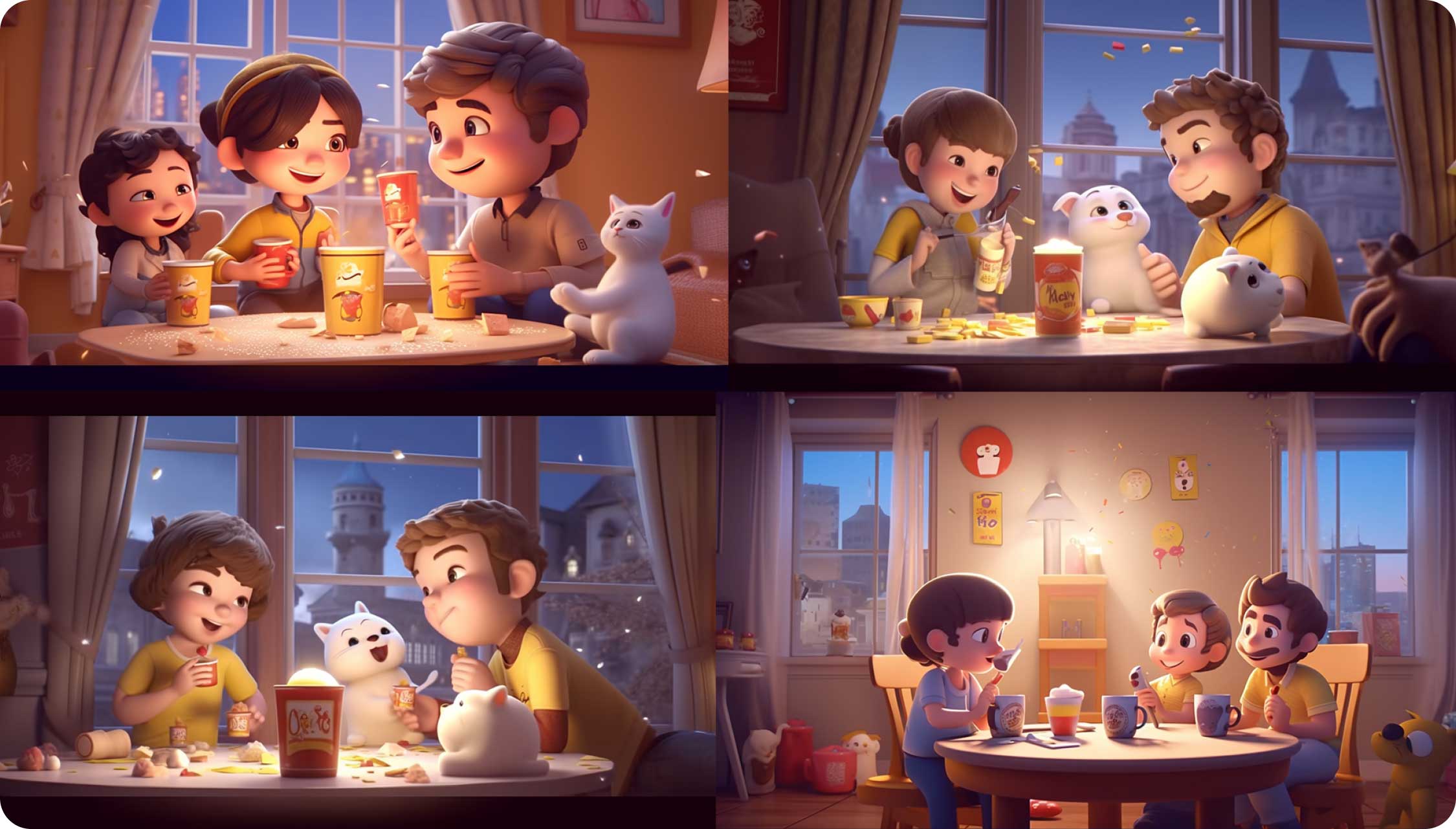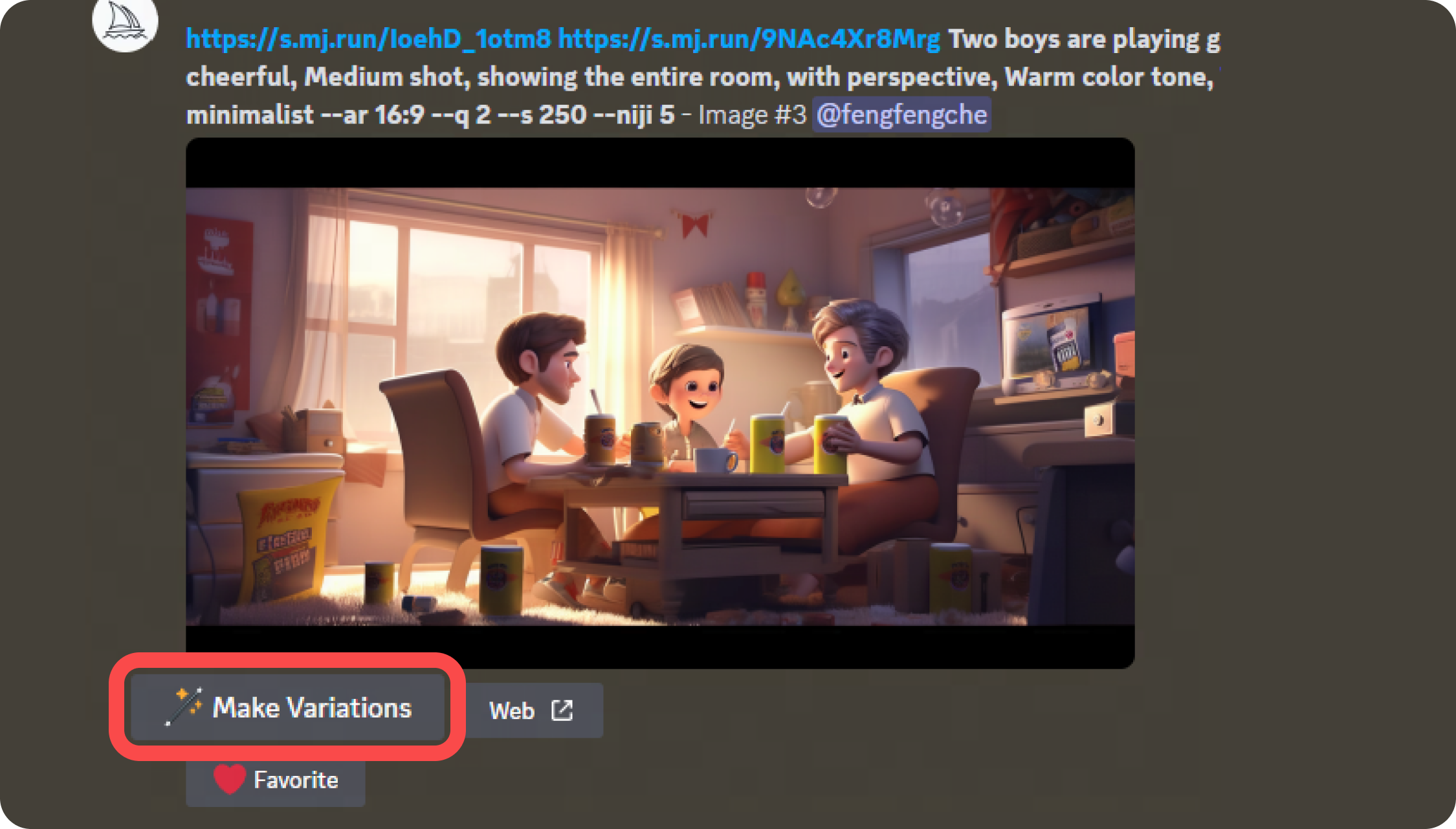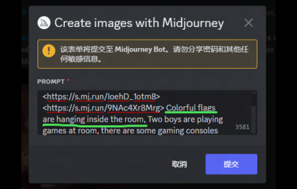 得到這張圖后,覺得畫面左上角部分有些空白,為了襯托歡快聚會的氛圍,我們決定在左上方加上掛旗。方法也是運用Midjourney的混音模式。在關鍵詞中加入“屋子里掛著彩旗”。