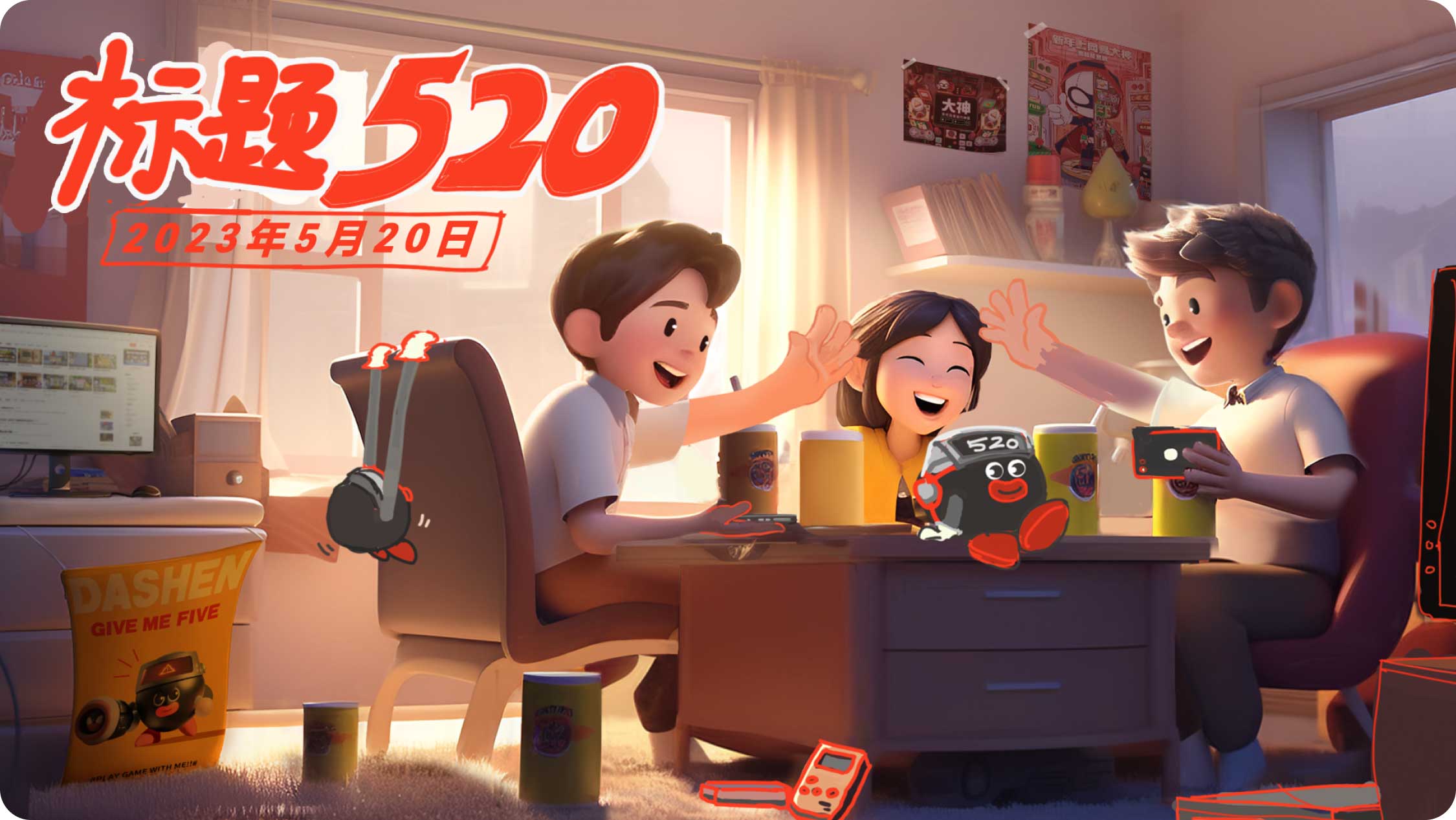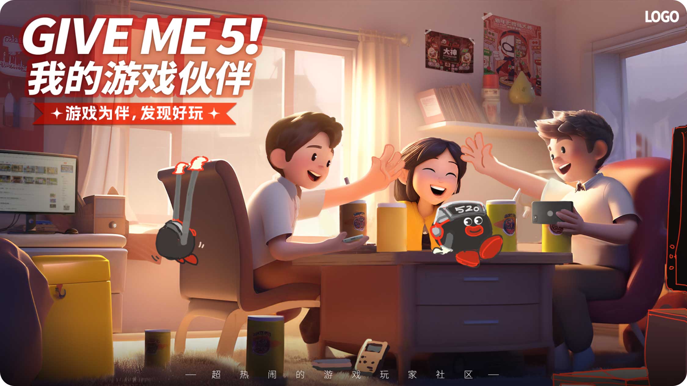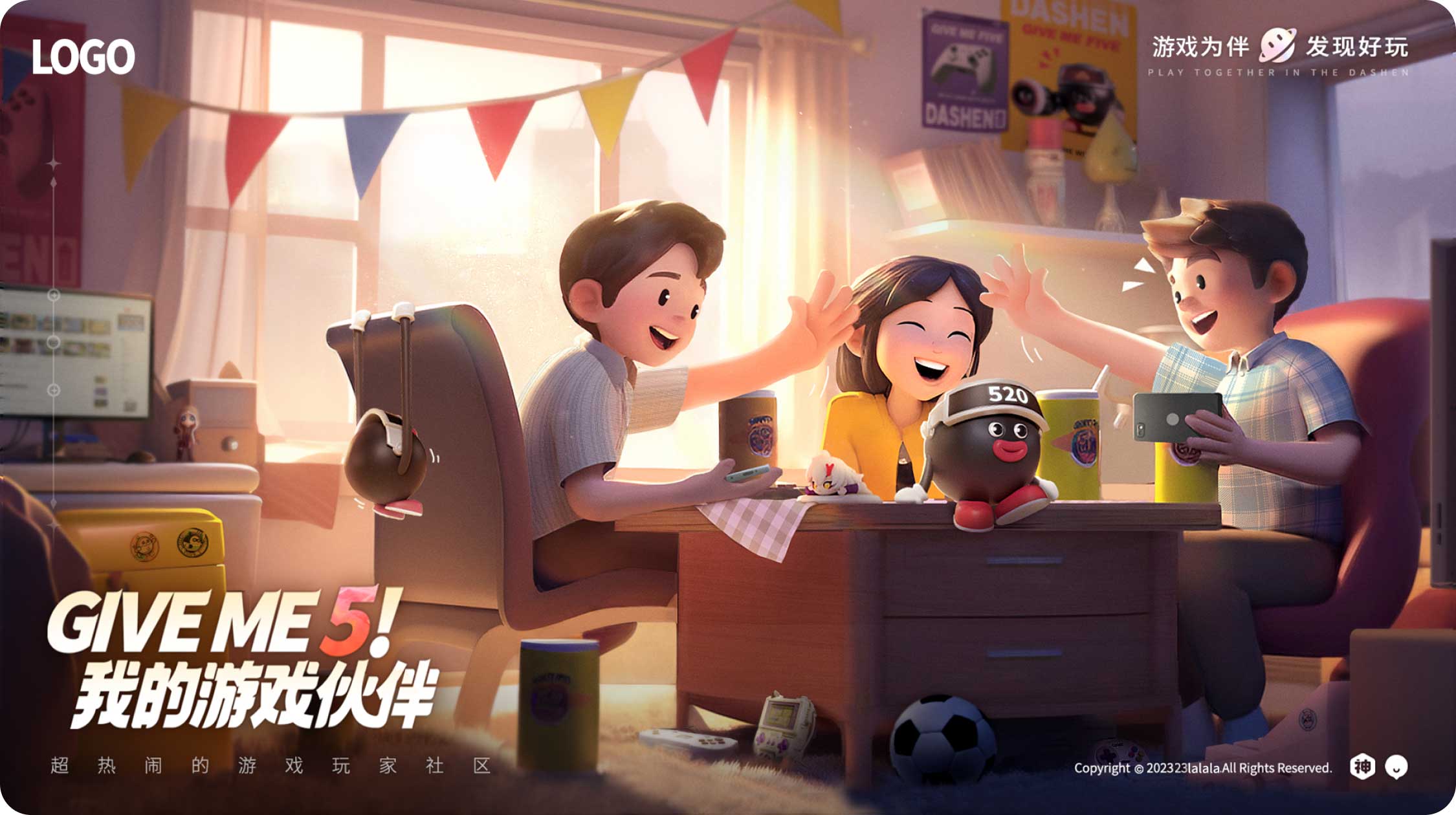 大概描繪了幾個伙伴在組隊玩游戲,因為獲得了勝利相互擊掌(give me 5)的輕松愉快的畫面。周圍有一些和游戲相關的元素,IP形象也在畫面中心露出,強調與品牌之間的關系。