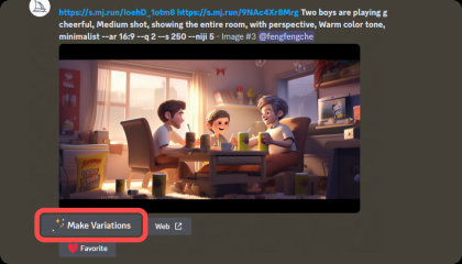 在前期,我們對構想的畫面進行關鍵詞的描述:“可愛帥氣的男女孩子們一起玩手機,開心地微笑著,舉起手歡呼,溫暖的房間,大型落地窗。”將關鍵詞翻譯后放入Midjourney中進行煉圖,最終篩選了幾張氛圍還不錯的進行下一步操作。