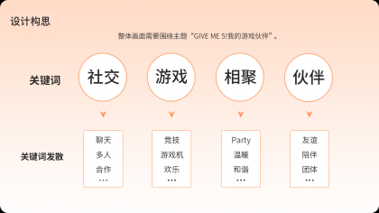 需求方希望畫面能展現出品牌的社交感,以“游戲伙伴”為主題,畫面表達各種不同類型游戲伙伴,因我們的產品而相聚的場景。同時希望畫面中的人物能做出擊掌(GIVE ME 5)的動作,以此呼應品牌發布會的主題。