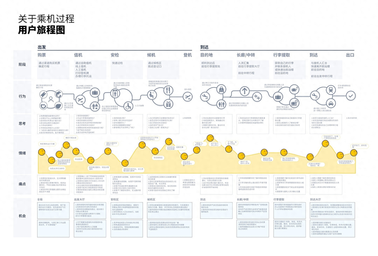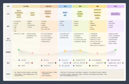 用戶旅程圖是一種圖形化工具,用于詳細描述用戶在使用產品或服務時所經歷的各個階段和步驟。它能夠展示用戶的整個使用過程,包括用戶的需求、痛點、態度和行為,以及產品或服務如何與用戶進行互動。作為產品設計者,我們可以通過用戶旅程圖更好地理解用戶需求,提前發現后續的用戶體驗問題,并思考如何提升產品或服務的用戶體驗。