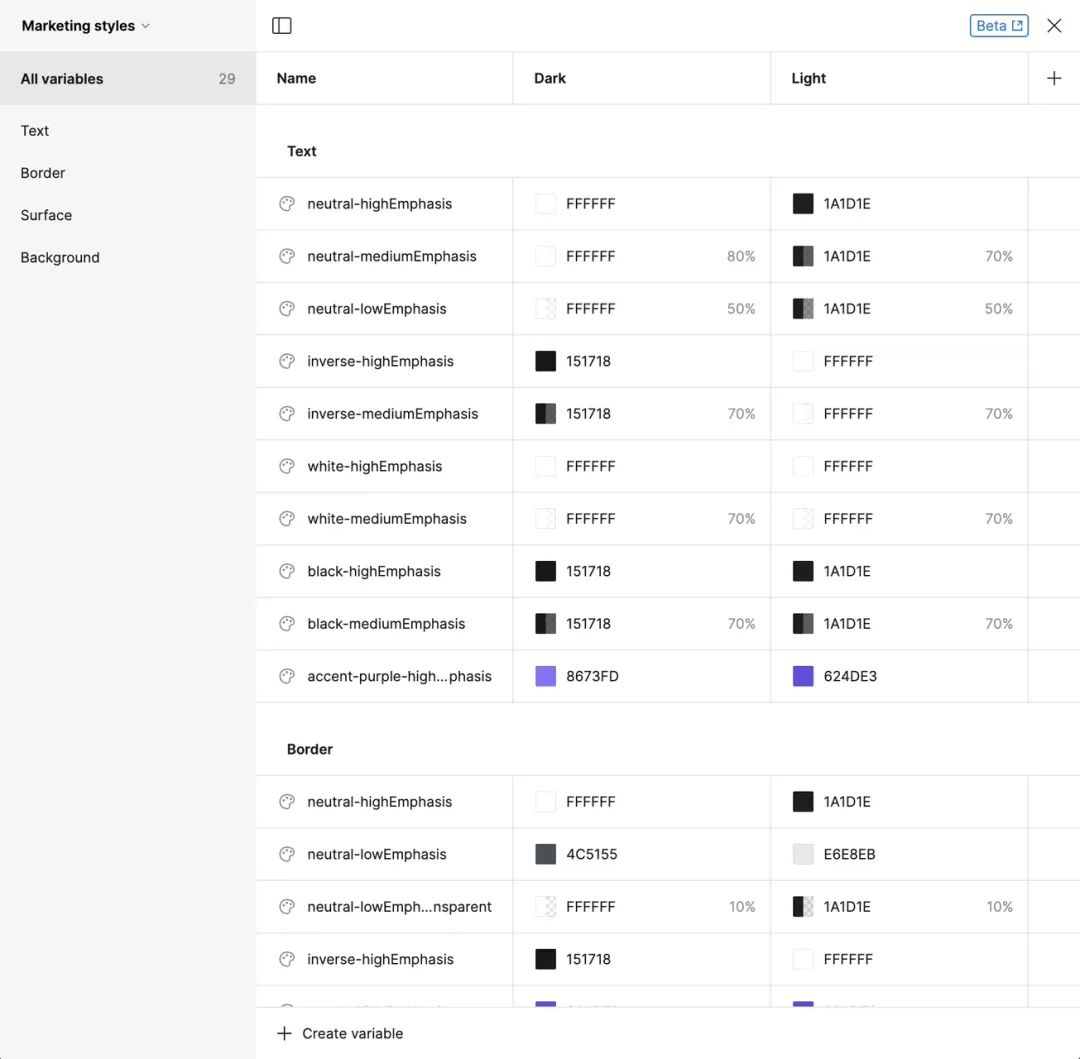 騰訊文檔顏色變量表 網上有很多關于如何使用軟件色彩樣式命名的方式來實現 Token 應用的案例,但隨著 Figma 的 Variables 功能的上線,新的應用方式已經改寫。同時,Variables 可以實現除了色彩以外的更多屬性的更改,從而讓 Token 的應用范圍在設計軟件中進一步擴大(國產軟件跟上也勢在必行)。
