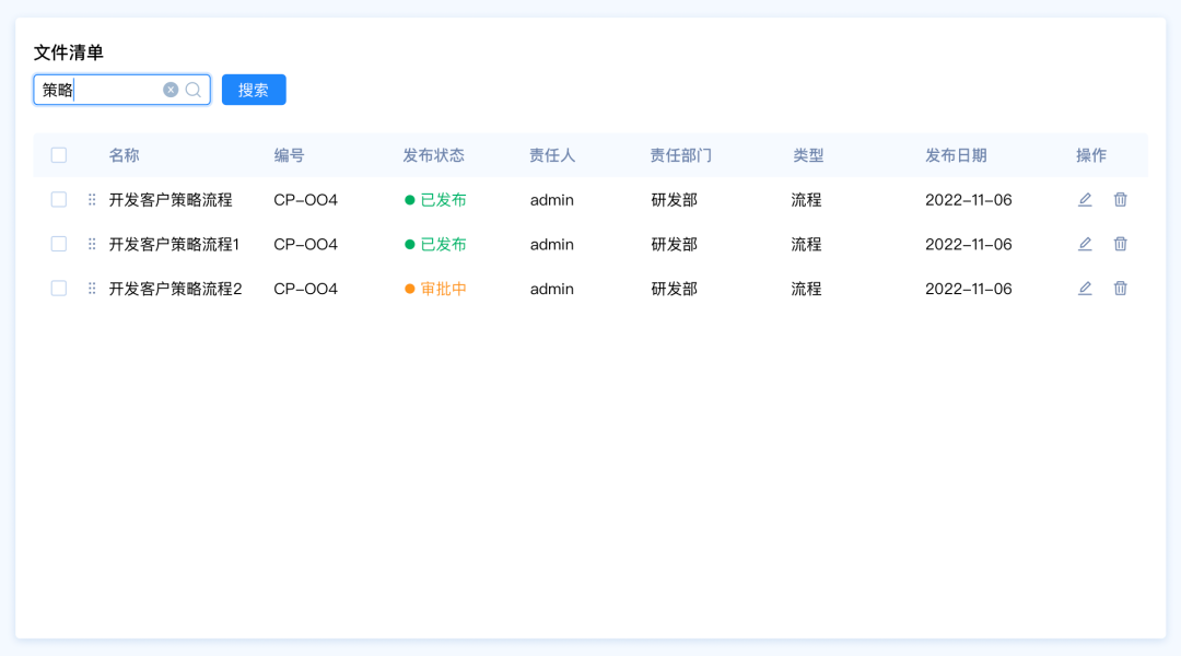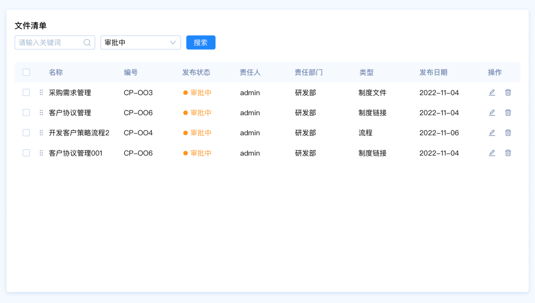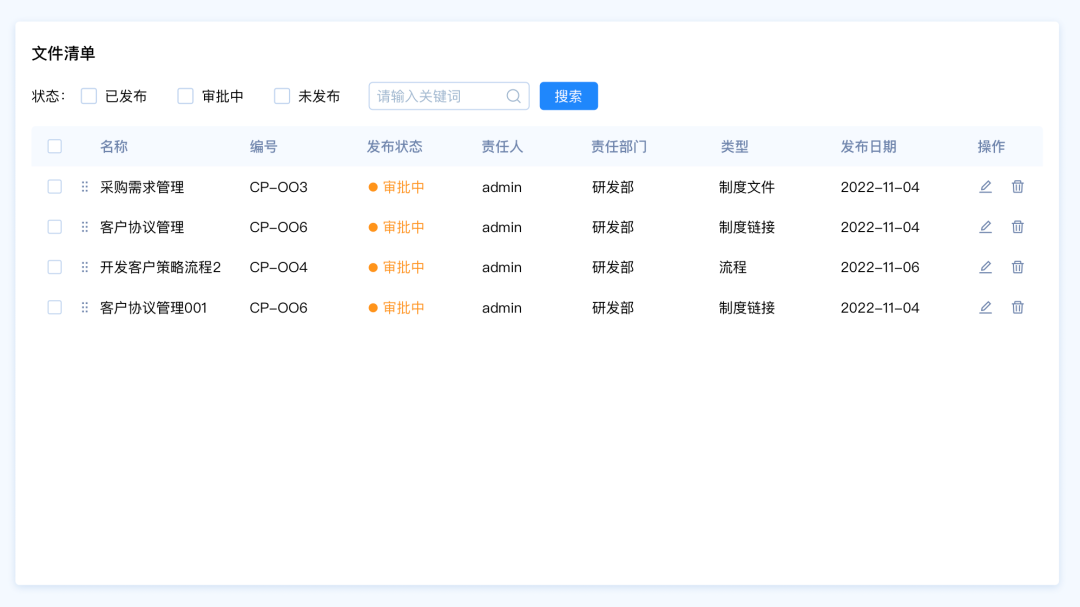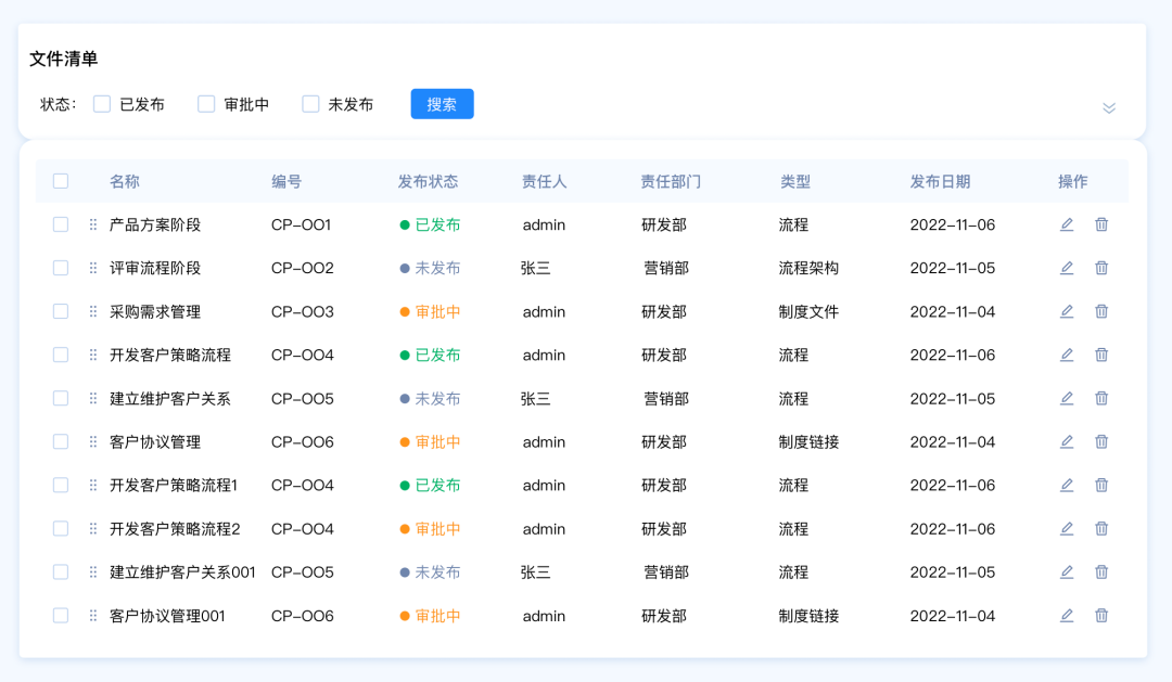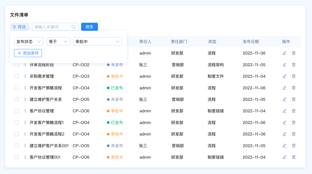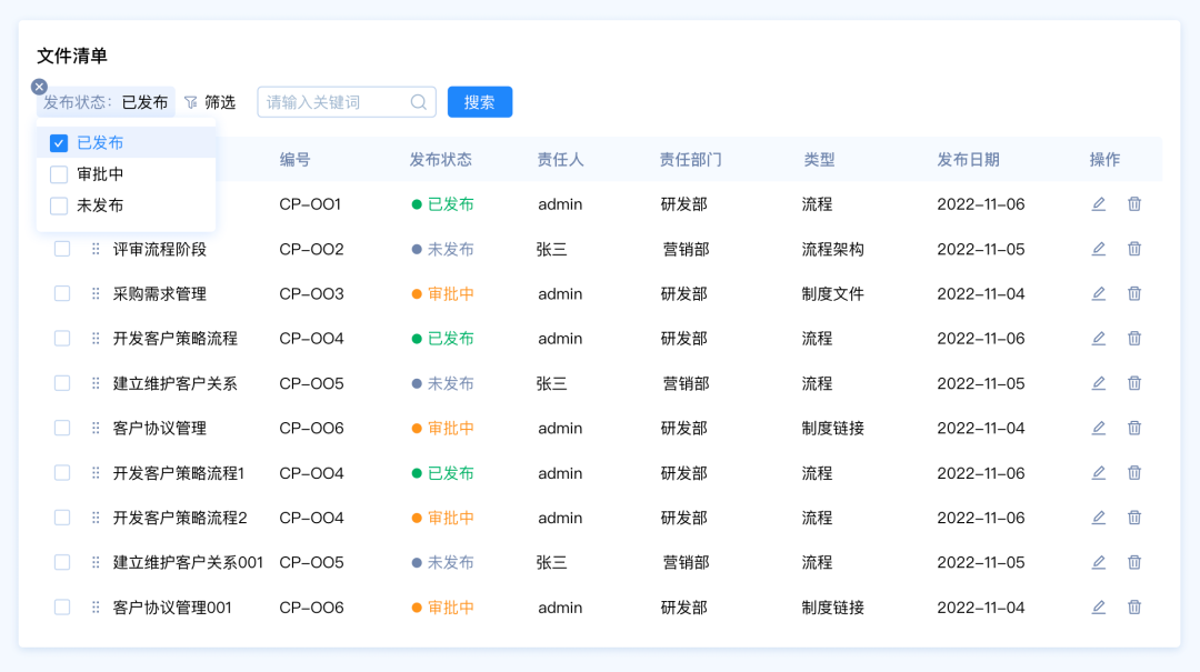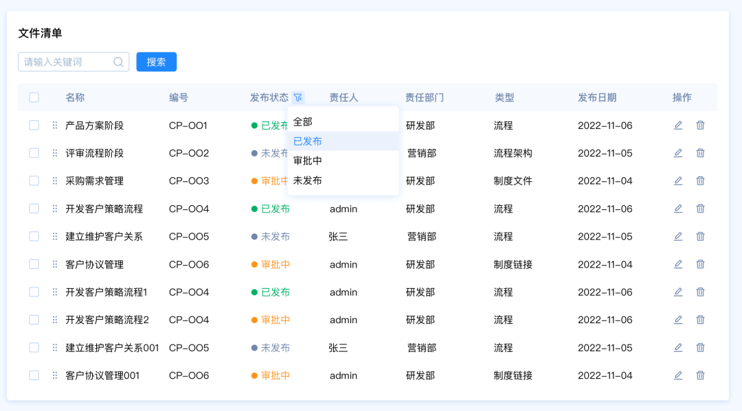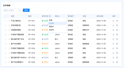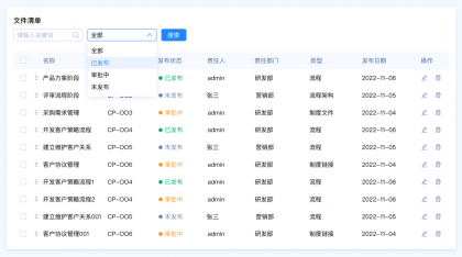 需求背景:客戶A想要快速篩選文件清單中發(fā)布狀態(tài)為“審批中”的數(shù)據(jù),希望能夠直接看到文件的狀態(tài)類型,快速選擇類型。