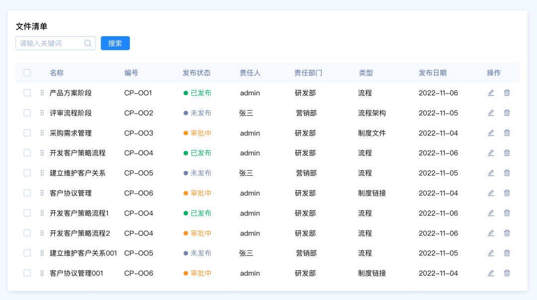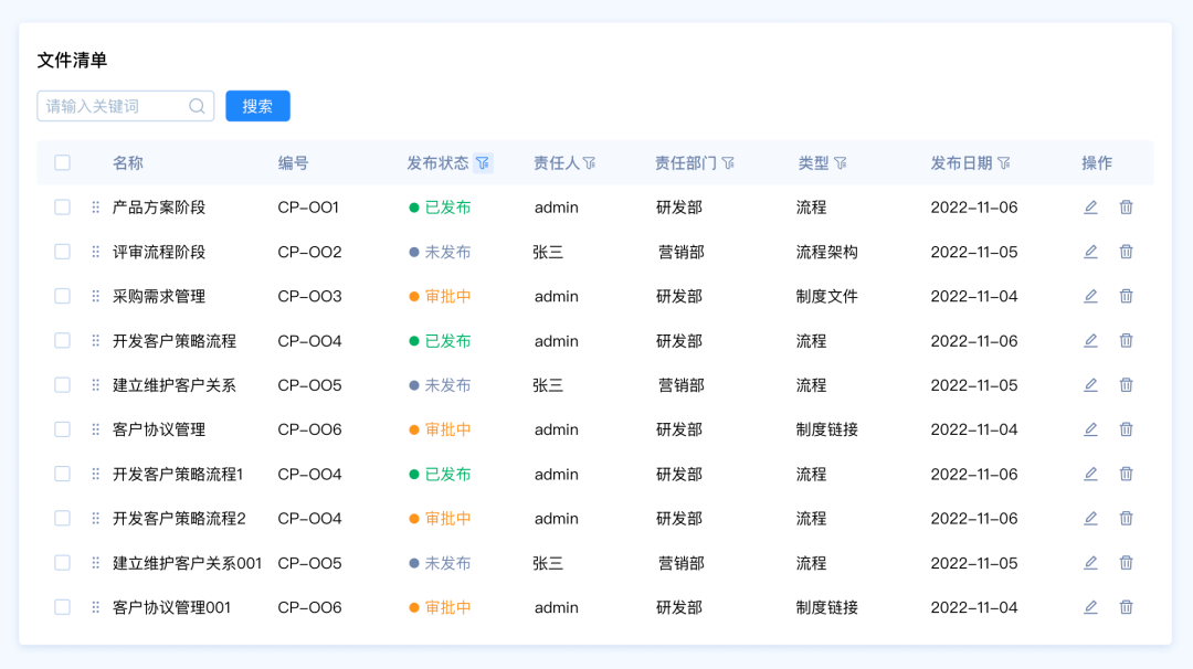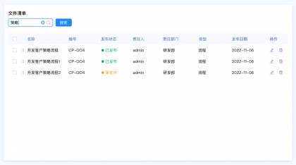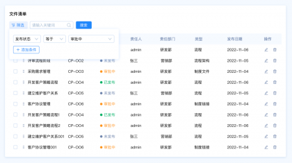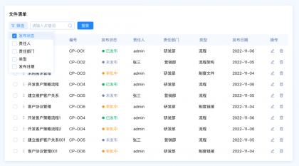 設(shè)計(jì)要點(diǎn):由于這里包含多種篩選類型,名稱和編號(hào)是關(guān)鍵詞篩選,發(fā)布狀態(tài)和、責(zé)任人、責(zé)任部門、類型是選項(xiàng)篩選,發(fā)布日期是時(shí)間區(qū)間篩選。所以我們需要采用組合篩選的模式。
