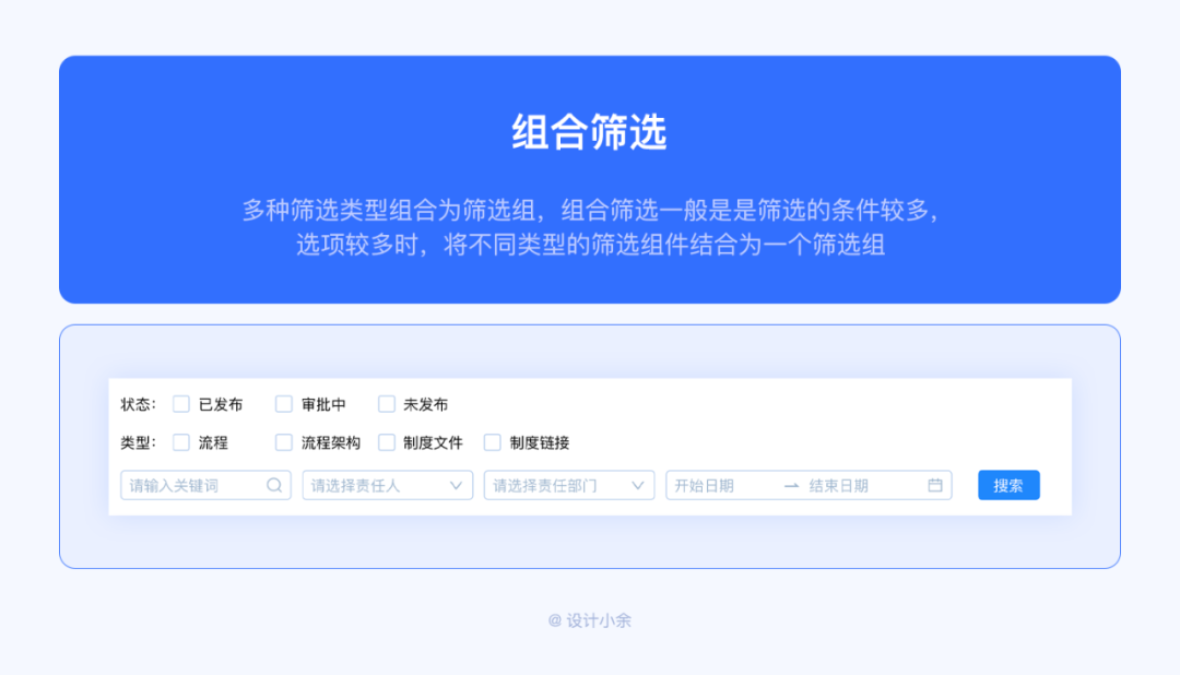 多種篩選類型組合為篩選組,組合篩選一般是是篩選的條件較多,選項(xiàng)較多時(shí),將不同類型的篩選組件結(jié)合為一個(gè)篩選組。用戶在使用時(shí),只需要將所有的條件輸入/選擇后,點(diǎn)擊搜索即可完成篩選,得到的結(jié)果將是多個(gè)條件組合后的并集/合集的值。