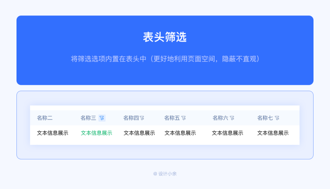 將篩選選項(xiàng)內(nèi)置在表頭中(更好地利用頁面空間,隱蔽不直觀)。當(dāng)頁面空間有限時(shí),可以考慮此方案。另外當(dāng)表格表頭字段數(shù)據(jù)較多時(shí),需要橫向滑動(dòng)查看數(shù)據(jù)時(shí),建議還是直接將篩選條件單獨(dú)放在外面。或者當(dāng)需要篩選的選項(xiàng)太多時(shí),表頭字段都能篩選時(shí),也可以考慮放在表頭中。