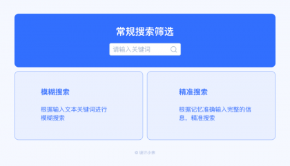 常規(guī)的搜索篩選不難理解,即常見的搜索框,根據(jù)輸入文本關(guān)鍵詞進(jìn)行模糊搜索或者根據(jù)記憶準(zhǔn)確輸入完整的信息,精準(zhǔn)搜索。文本關(guān)鍵詞搜索需要通過用戶的記憶來完成,只有當(dāng)用戶對(duì)需要搜索的內(nèi)容(關(guān)鍵詞)有記憶才能完成搜索篩選,搜索的結(jié)果范圍根據(jù)關(guān)鍵詞的精準(zhǔn)度而定。