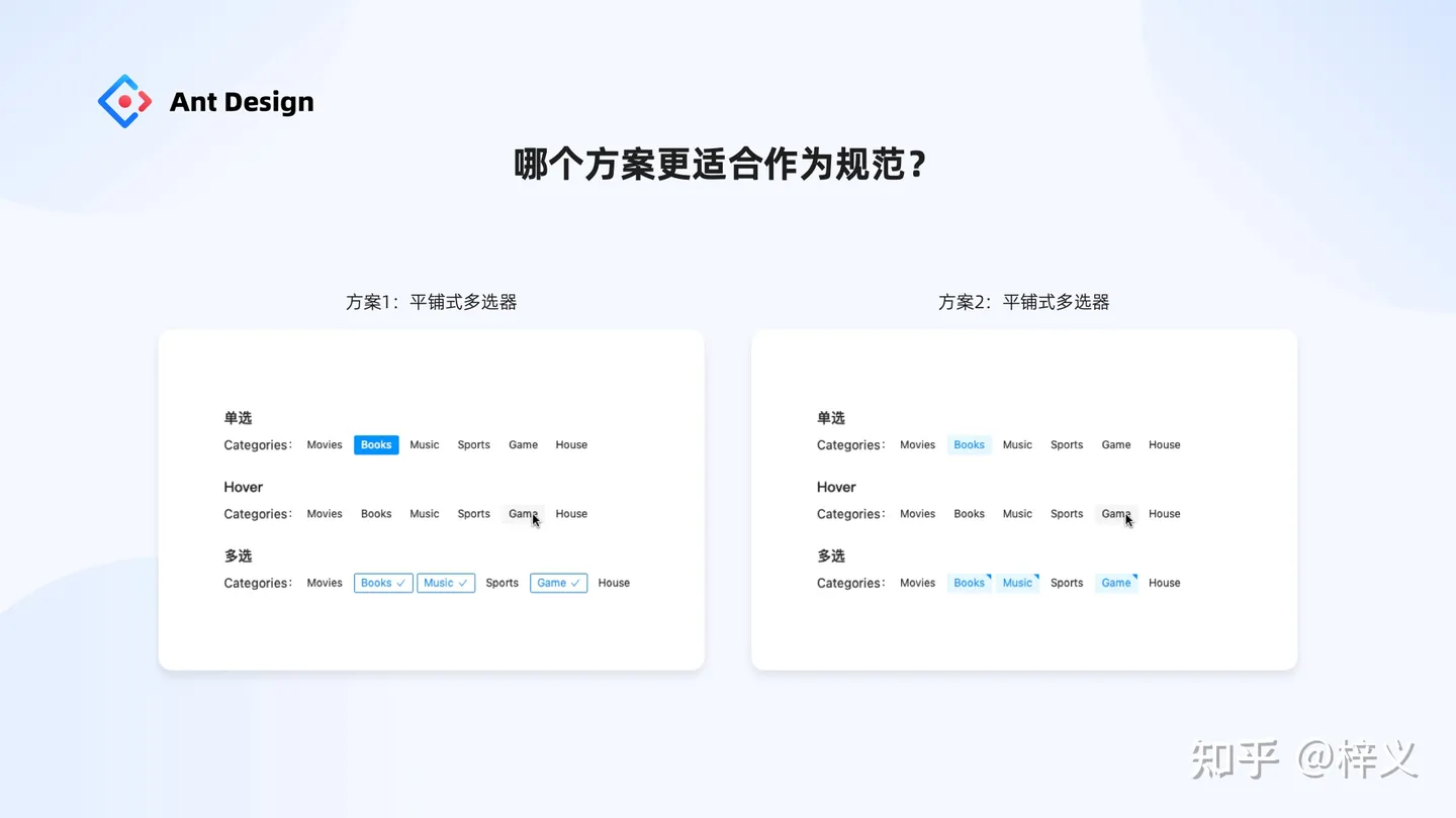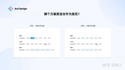 最后一個問題,某設計系統需要建設平鋪式多選器這樣一類組件,我們有兩位設計師出了兩套方案,請問哪個方案更適合作為規范納入到設計系統當中呢?