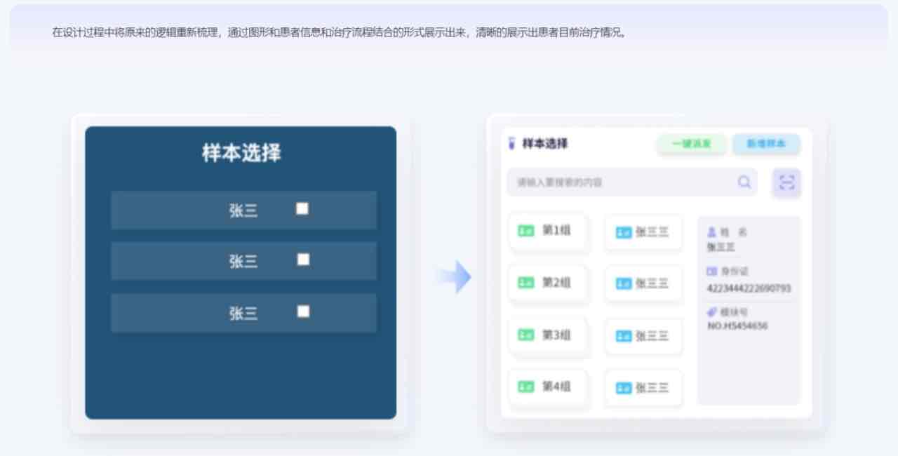 在設(shè)計(jì)過(guò)程中將原來(lái)的邏輯重新梳理,通過(guò)圖形和患者信息和治療流程結(jié)合的形式展示出來(lái),清晰的展示出患者目前治療情況。