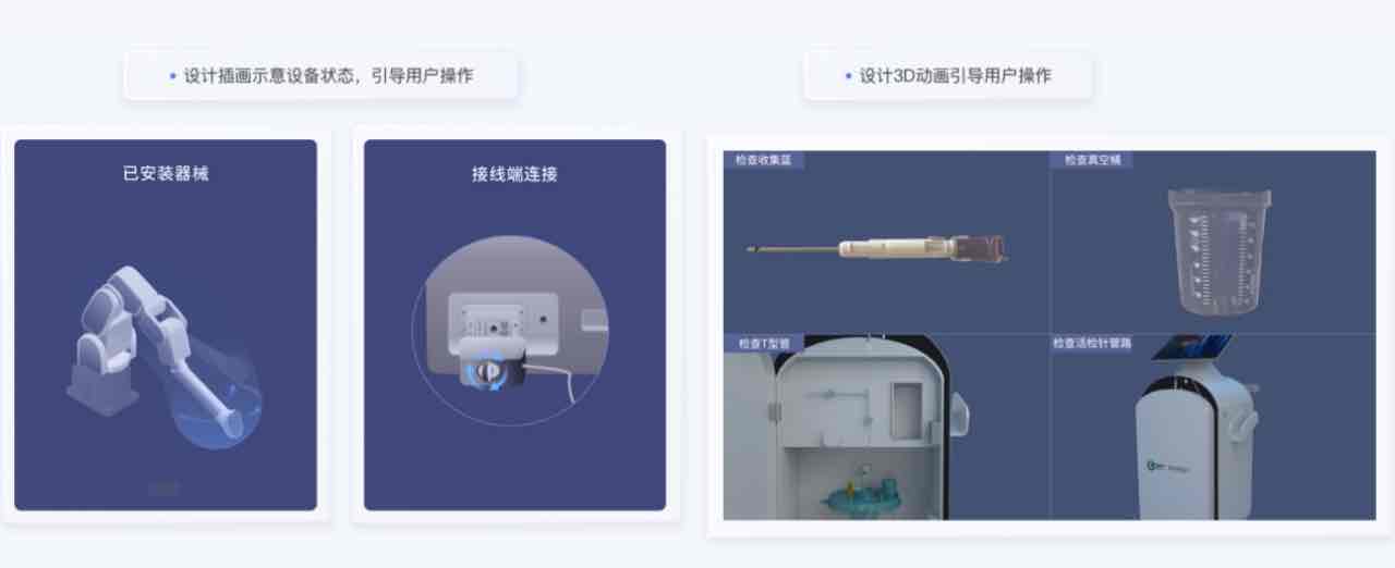 隨著科技的飛速發(fā)展,人工智能(AI)正悄悄改變醫(yī)療健康行業(yè),為其帶來(lái)前所未有的數(shù)字化轉(zhuǎn)型。未來(lái),醫(yī)療健康行業(yè)將迎來(lái)個(gè)性化、精準(zhǔn)化、智能化的新時(shí)代。設(shè)備操作界面是醫(yī)師操控機(jī)器人的窗口,操作界面設(shè)計(jì)易用、直觀、美觀度直接影響到醫(yī)療機(jī)器人的使用效果和產(chǎn)品的品牌價(jià)值。人性化的操作界面可以提高操作者的工作效率和操作的舒適度,降低操作的學(xué)習(xí)成本和出錯(cuò)率,提高手術(shù)精準(zhǔn)度和手術(shù)成功率。在UI設(shè)計(jì)中,我們結(jié)合真實(shí)的使用場(chǎng)景,加入插畫(huà)和建模動(dòng)畫(huà)的設(shè)計(jì),引導(dǎo)醫(yī)護(hù)人員進(jìn)行操作,從而使操作更加直觀易用,提高工作效率。
