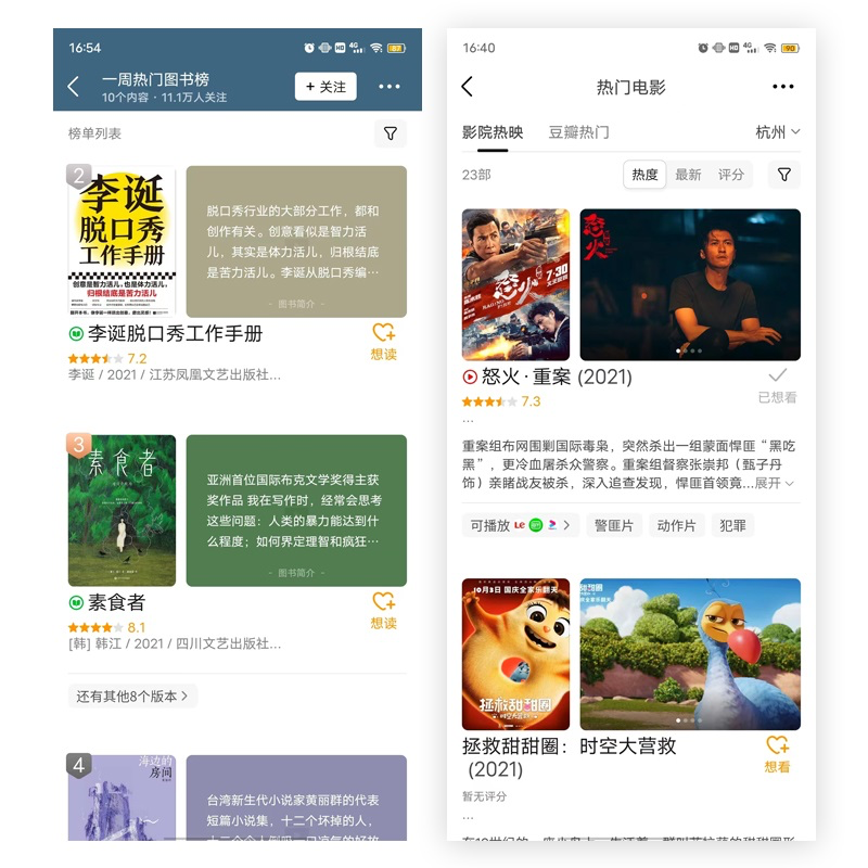 豆瓣的電影榜單設計非常巧妙:豎幅圖片完美展示電影海報,橫幅區(qū)域則用于劇照輪播。這種豎橫搭配不僅視覺和諧,還能比單圖展示更高效地利用空間。這個設計模式同樣適用于圖書榜單,橫幅區(qū)域可以展示書評。通過呈現豐富的信息,用戶能在列表頁就對內容有更全面的了解,從而提高查看詳情頁的意愿。