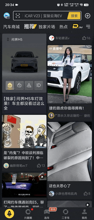 如今各大 APP 的信息流千篇一律,都是圖文、視頻、廣告的組合,用戶在不斷滑動中逐漸失去了新鮮感。懂車帝巧妙地為了推廣自家的在線 3D 看車功能,為信息流帶來了全新玩法!他們在首頁信息流中嵌入了可交互的 3D 汽車模型,這種既能觀看又能操作的創(chuàng)新形式,與傳統的圖文視頻形式形成鮮明對比,立即吸引了用戶的注意力,讓人忍不住想要嘗試。