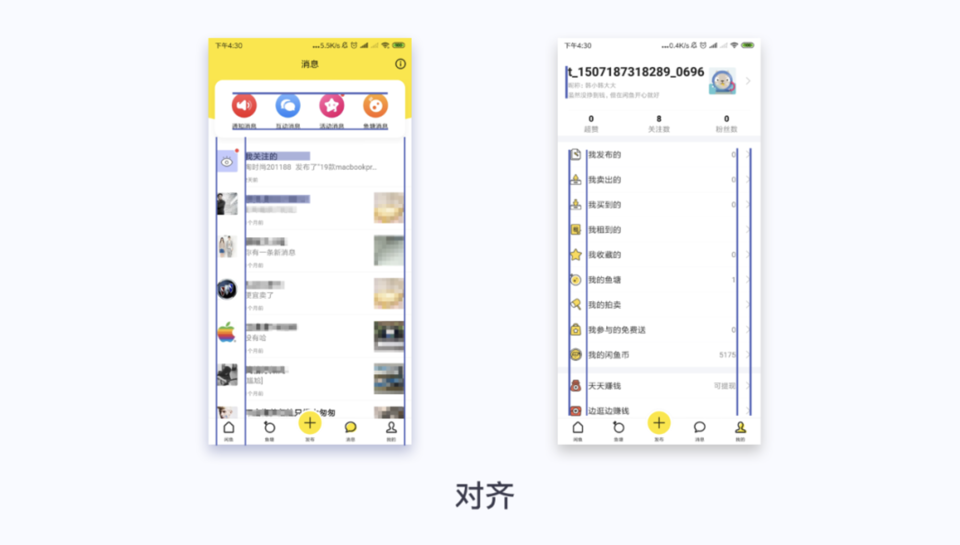 閑魚(yú)我的頁(yè)面,功能圖標(biāo)和信息左對(duì)齊顯示,消息和進(jìn)入按鈕右對(duì)齊顯示;贊賞、關(guān)注、粉絲居中顯示。