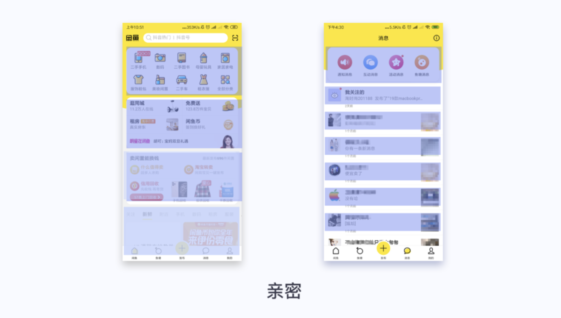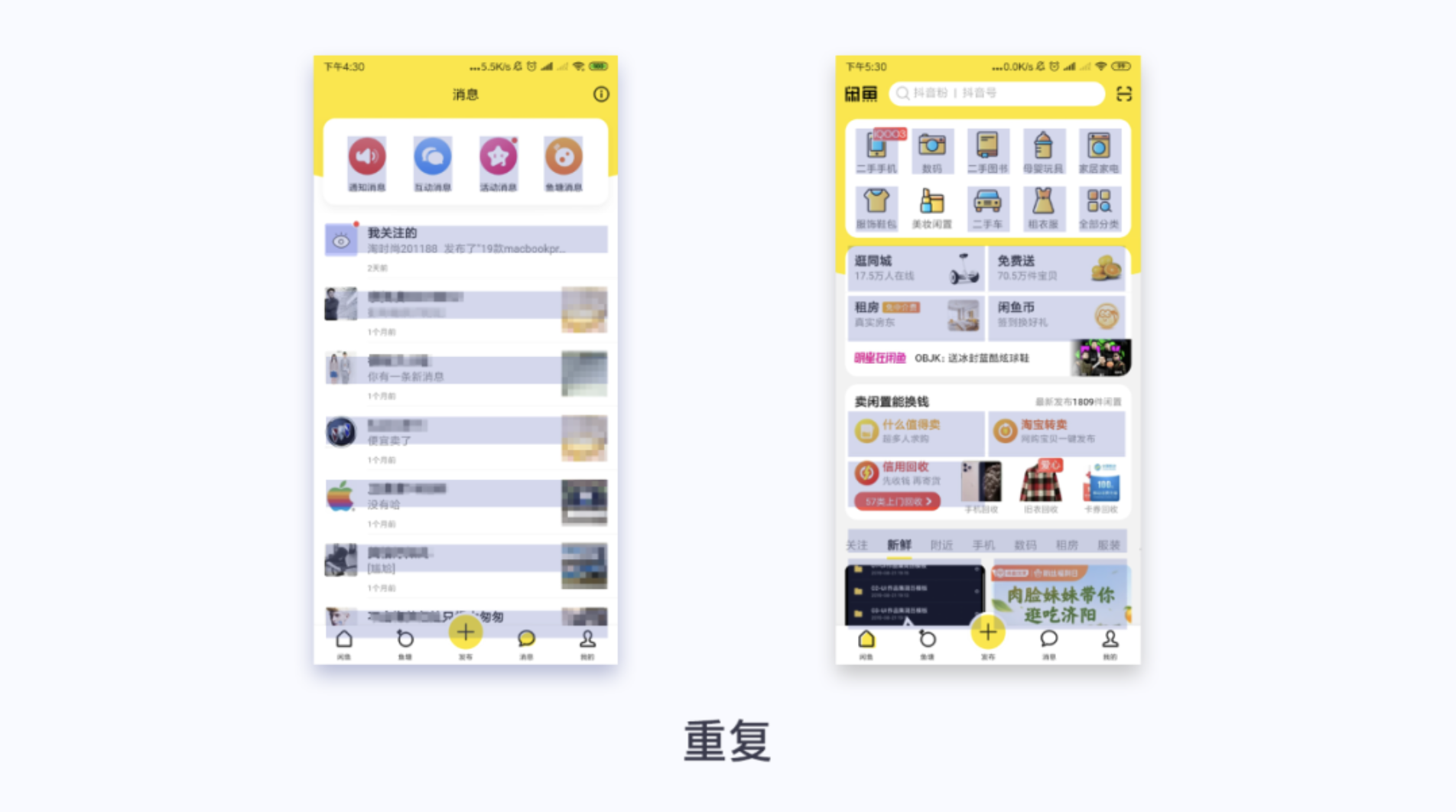 閑魚(yú)消息頁(yè)面,頭部功能區(qū)域圓形圖標(biāo)重復(fù),字體重復(fù)。消息列表頭像、名稱(chēng)、消息、圖片重復(fù),保持一致性,和統(tǒng)一。
