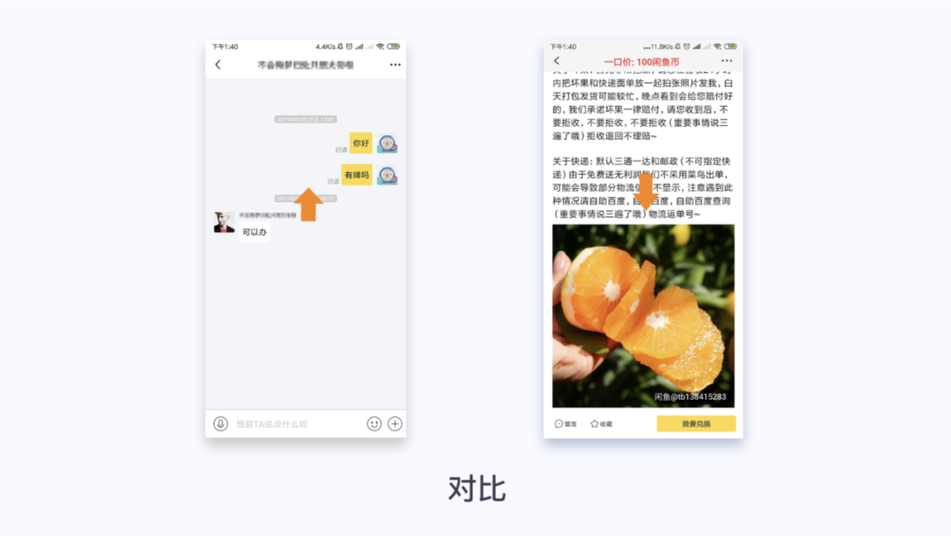 閑魚(yú)聊天頁(yè)面,雙方消息顏色對(duì)比,色彩的對(duì)比更加強(qiáng)的雙方聊天的視覺(jué)效果,對(duì)比也是比較明顯。