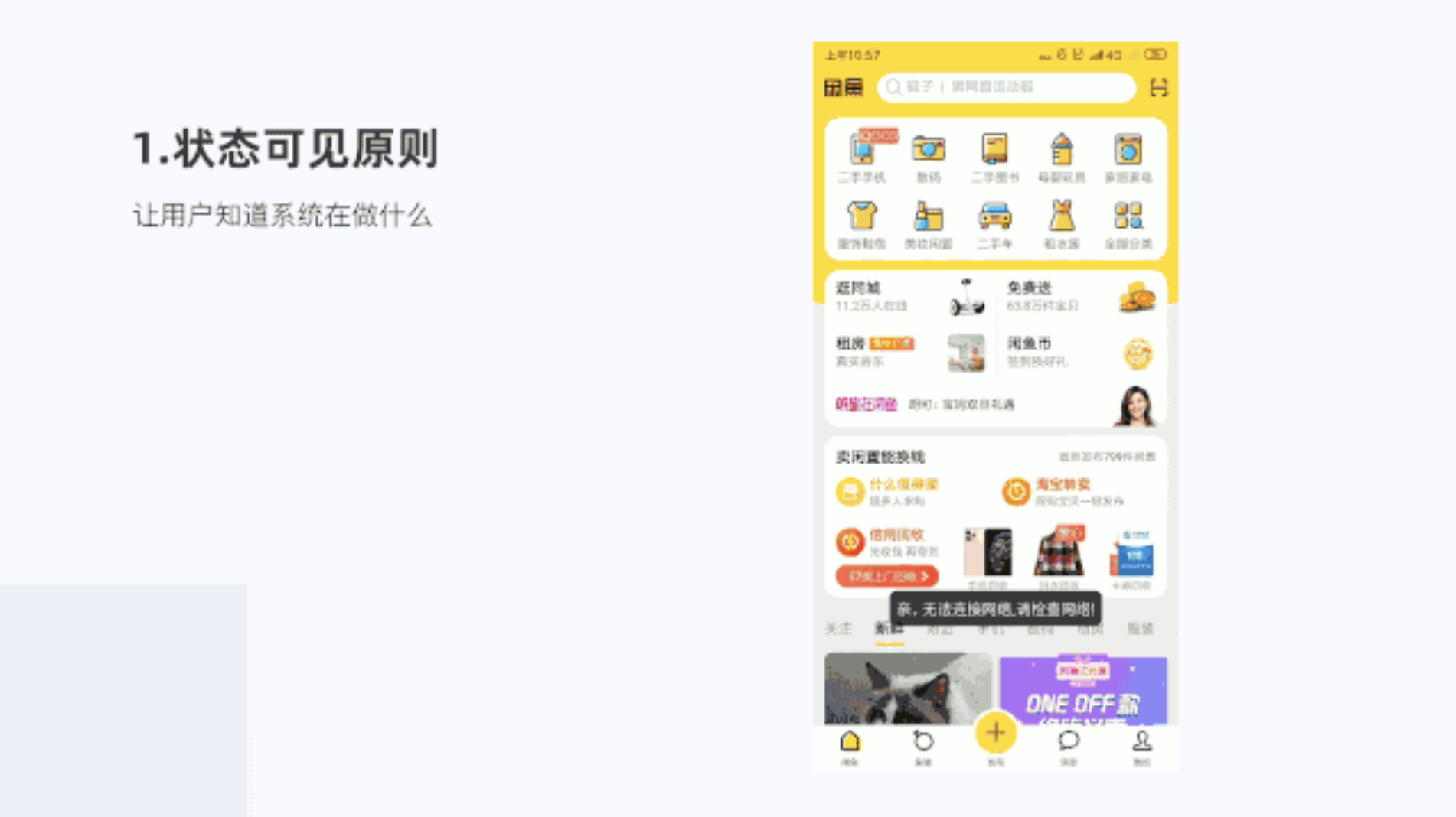 今天我們主要從用戶(hù)體驗(yàn)的部分原則來(lái)看閑魚(yú),主要以產(chǎn)品視覺(jué)設(shè)計(jì)四大原則、交互設(shè)計(jì)十大可用性原則、情感化設(shè)計(jì)來(lái)看閑魚(yú)