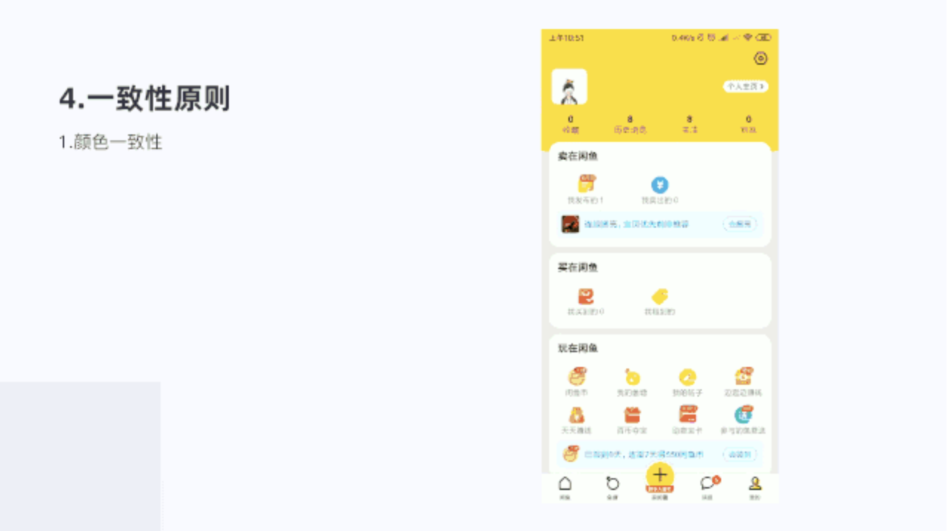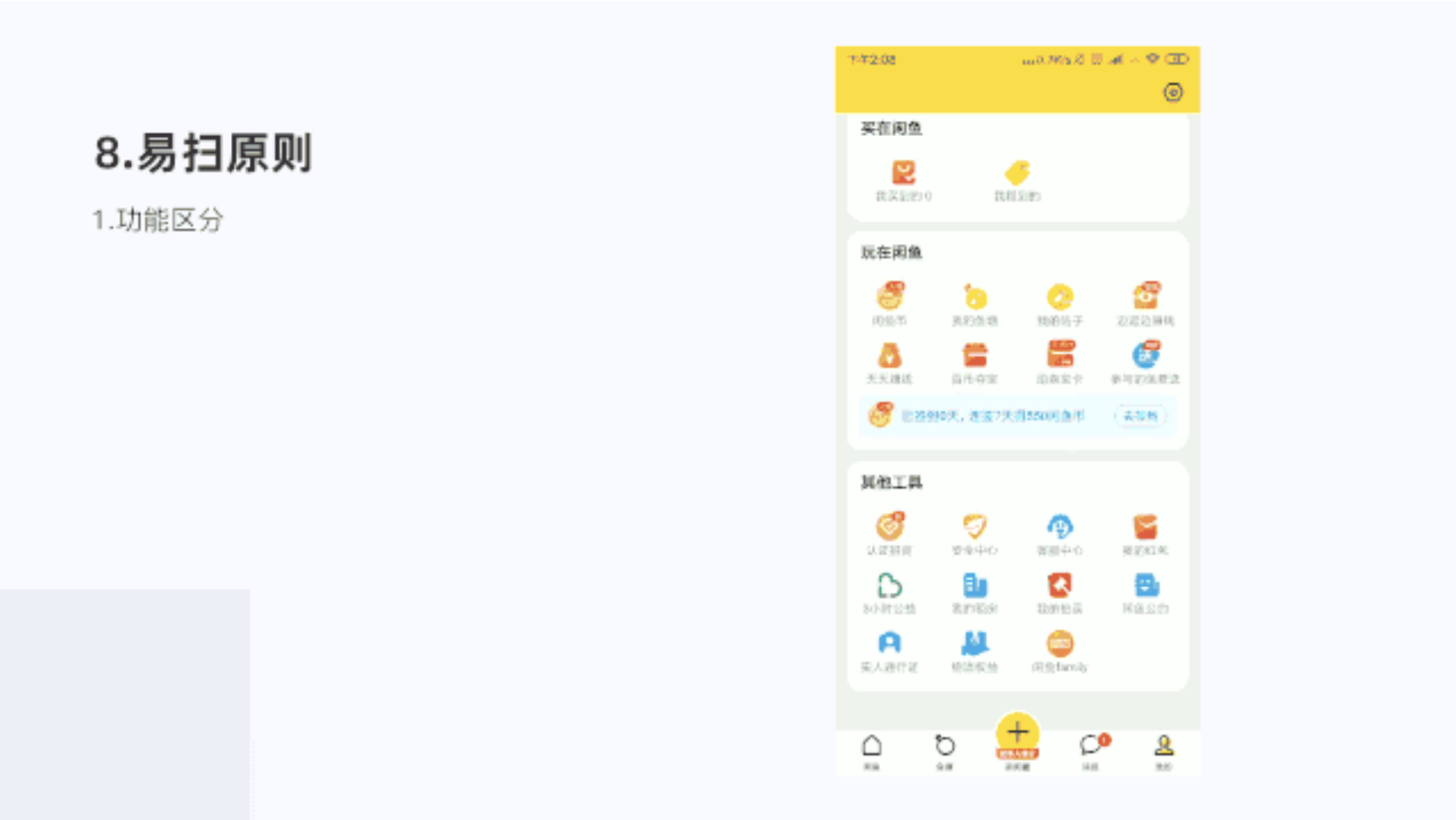閑魚(yú)的我的頁(yè)面,每個(gè)區(qū)塊進(jìn)行功能區(qū)分,分為買(mǎi)、賣(mài)、玩、其他4個(gè)主要部分。降調(diào)層級(jí),同時(shí)在區(qū)塊內(nèi)每個(gè)功能圖標(biāo)宮格顯示,也易于用戶(hù)查找,滿(mǎn)足了易掃原則,提示了用戶(hù)體驗(yàn)。