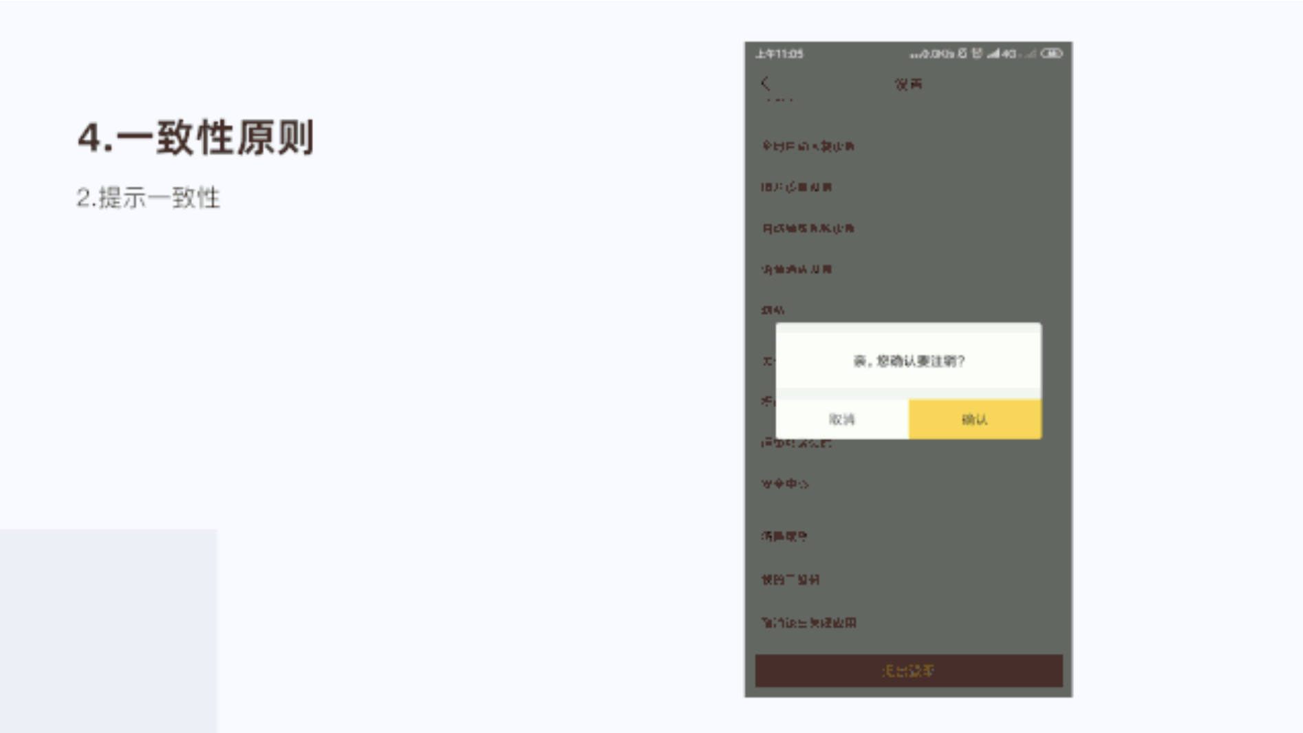 在退出登錄提示是否要注銷(xiāo)登錄,把確認(rèn)層級(jí)加大,放在右邊,清晰提示用戶(hù),防止用戶(hù)出錯(cuò)