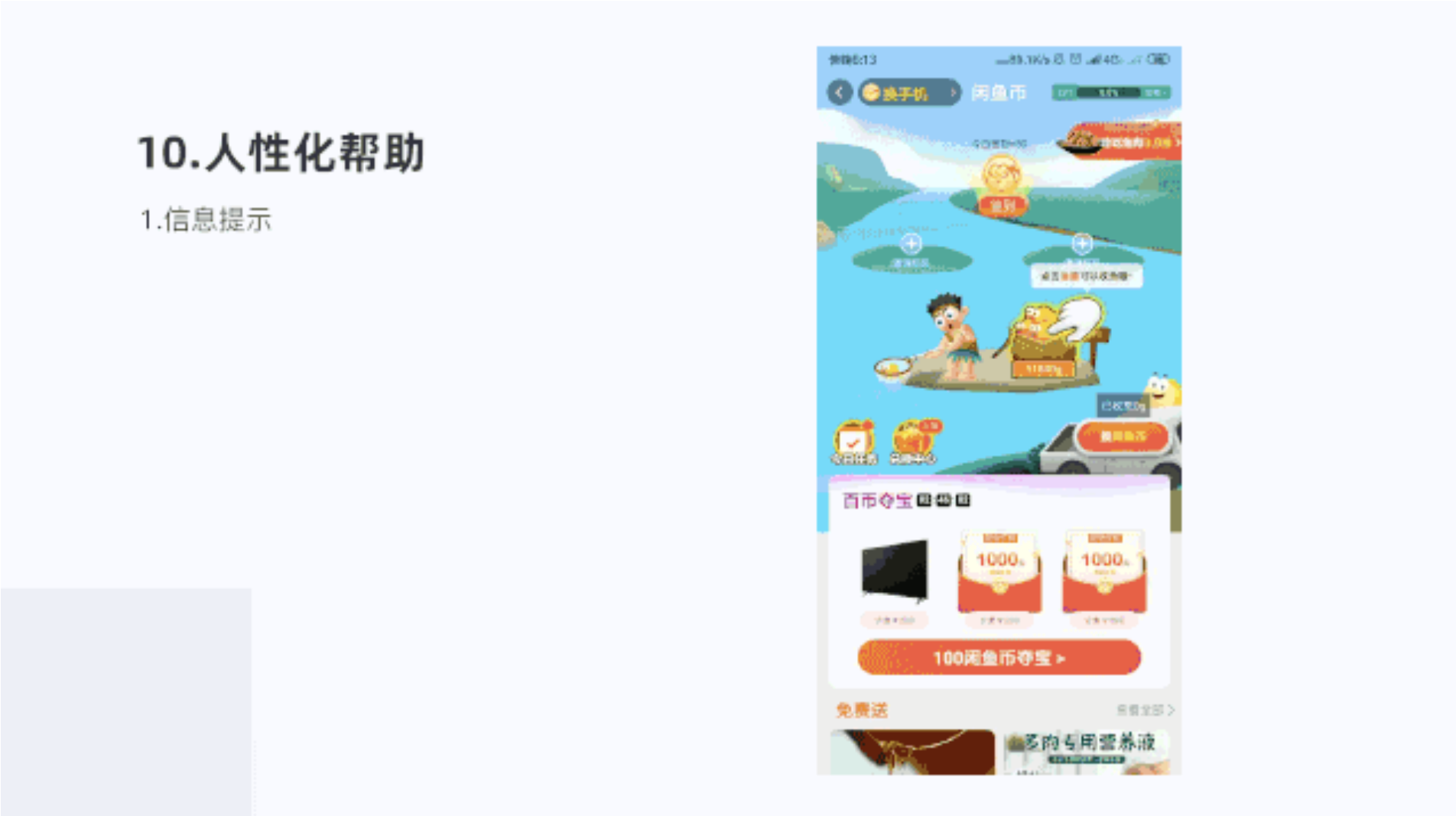 目標(biāo)引導(dǎo)設(shè)計(jì),劃定規(guī)則和目標(biāo)路徑,引導(dǎo)用戶(hù)參與其中,在簽到活動(dòng)頁(yè)面一個(gè)小路徑,用戶(hù)點(diǎn)擊撈魚(yú),撈上來(lái)之后,就可以?xún)稉Q閑魚(yú)幣了,讓用戶(hù)趣味游戲同時(shí)獲得閑魚(yú)幣,提升參與感,增強(qiáng)了用戶(hù)體驗(yàn)。