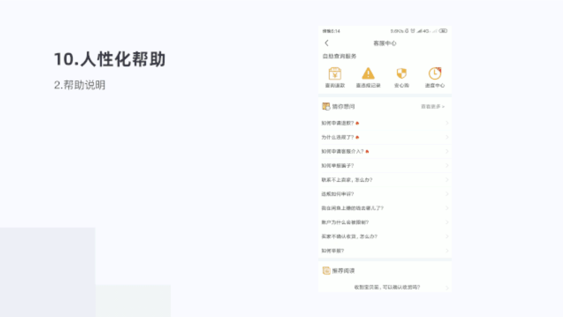 閑魚(yú)的幫助說(shuō)明功能更加全面,滿(mǎn)足不用用戶(hù)場(chǎng)景的問(wèn)題需求,也能及時(shí)和客戶(hù)進(jìn)行咨詢(xún)反饋信息。