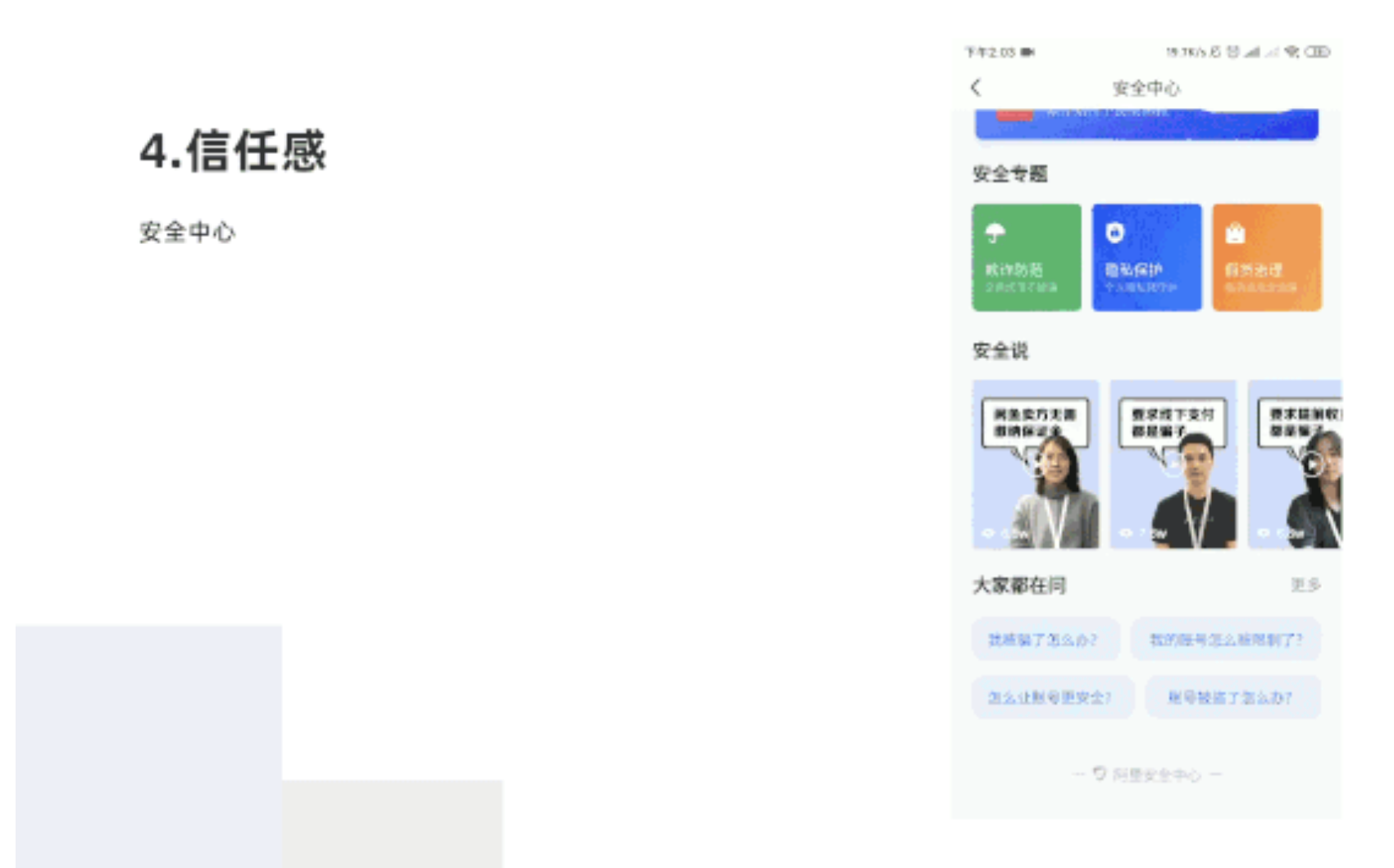 我的頁(yè)面有安全中心,可以購(gòu)買(mǎi)欺詐保障,了解安全知識(shí)和安全操作,減輕用戶(hù)交流,提升信任感。