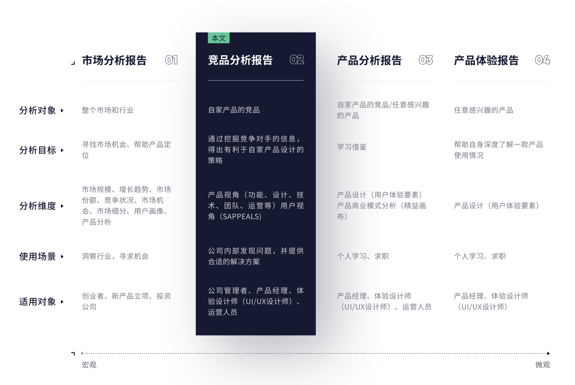 - 競品分析報告:分析對象是自家產品的競品,目標是學習借鑒,分析維度為產品分析,使用場景是公司內部發現問題并提供參考,適用對象是產品經理、體驗設計師等。