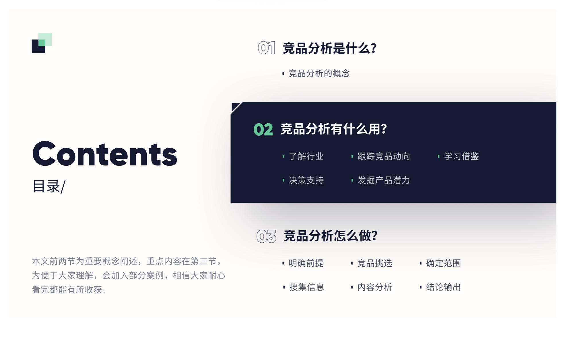- 決策支持:判斷是否進入新市場、是否做新產品,若確定,幫助新產品定位,找到細分市場和人群,制定競爭策略,避免與行業巨頭正面硬杠。