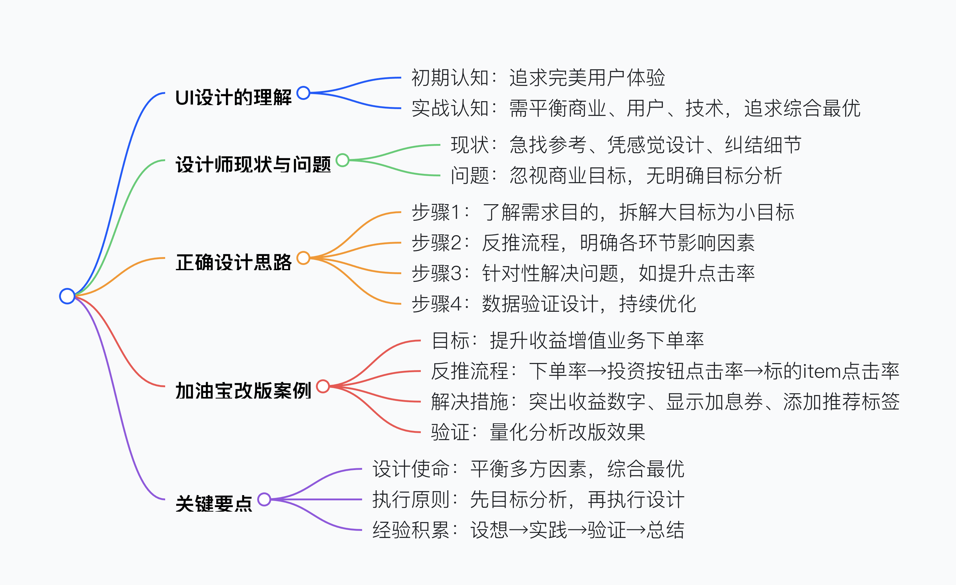 UI 設(shè)計(jì)的終極目標(biāo)并非單純追求極致用戶體驗(yàn),而是在「商業(yè)」「用戶」「技術(shù)」等多方面條件限制下取得平衡,得出「綜合最優(yōu)」的解決方案。設(shè)計(jì)師常陷入拿到需求就找參考、憑感覺(jué)設(shè)計(jì)、在細(xì)節(jié)糾結(jié)的誤區(qū),正確做法是先明確需求背后的商業(yè)目標(biāo),將大目標(biāo)拆解為小目標(biāo),如加油寶 APP6.0 改版時(shí)為提升 “收益增值業(yè)務(wù)下單率”,反推需提升標(biāo)的 item 點(diǎn)擊率、“立即投資” 按鈕點(diǎn)擊率等,再針對(duì)性解決,最后通過(guò)數(shù)據(jù)驗(yàn)證設(shè)計(jì)效果,如此才能積累經(jīng)驗(yàn)、理清思路。