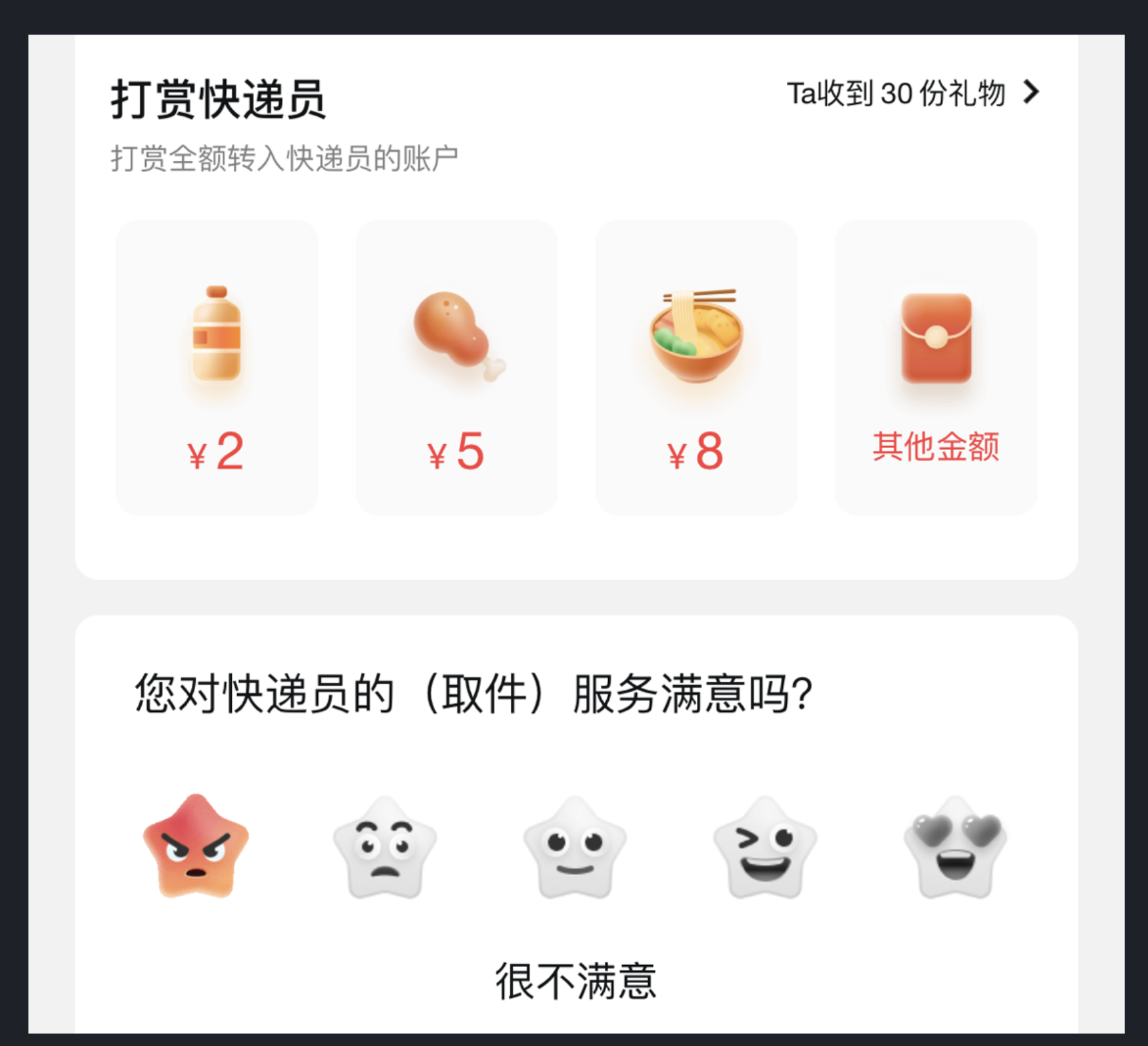 順豐速運在用戶完成快遞服務后,通過打賞功能和滿意度評價環(huán)節(jié),用直觀的表情圖標體現(xiàn)不同滿意度等級(很不滿意、不滿意、一般、滿意、非常滿意),并搭配具體評價選項,既形象傳遞信息,又提升了用戶參與度。