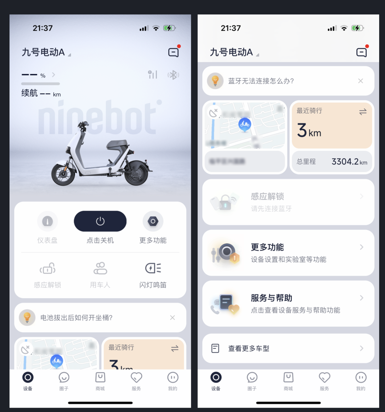 九號出行 App 體現(xiàn)了 Bento UI 設計趨勢,界面如便當盒般有清晰區(qū)塊劃分,功能區(qū)分明確,整體整齊美觀,富有層次感、現(xiàn)代感。