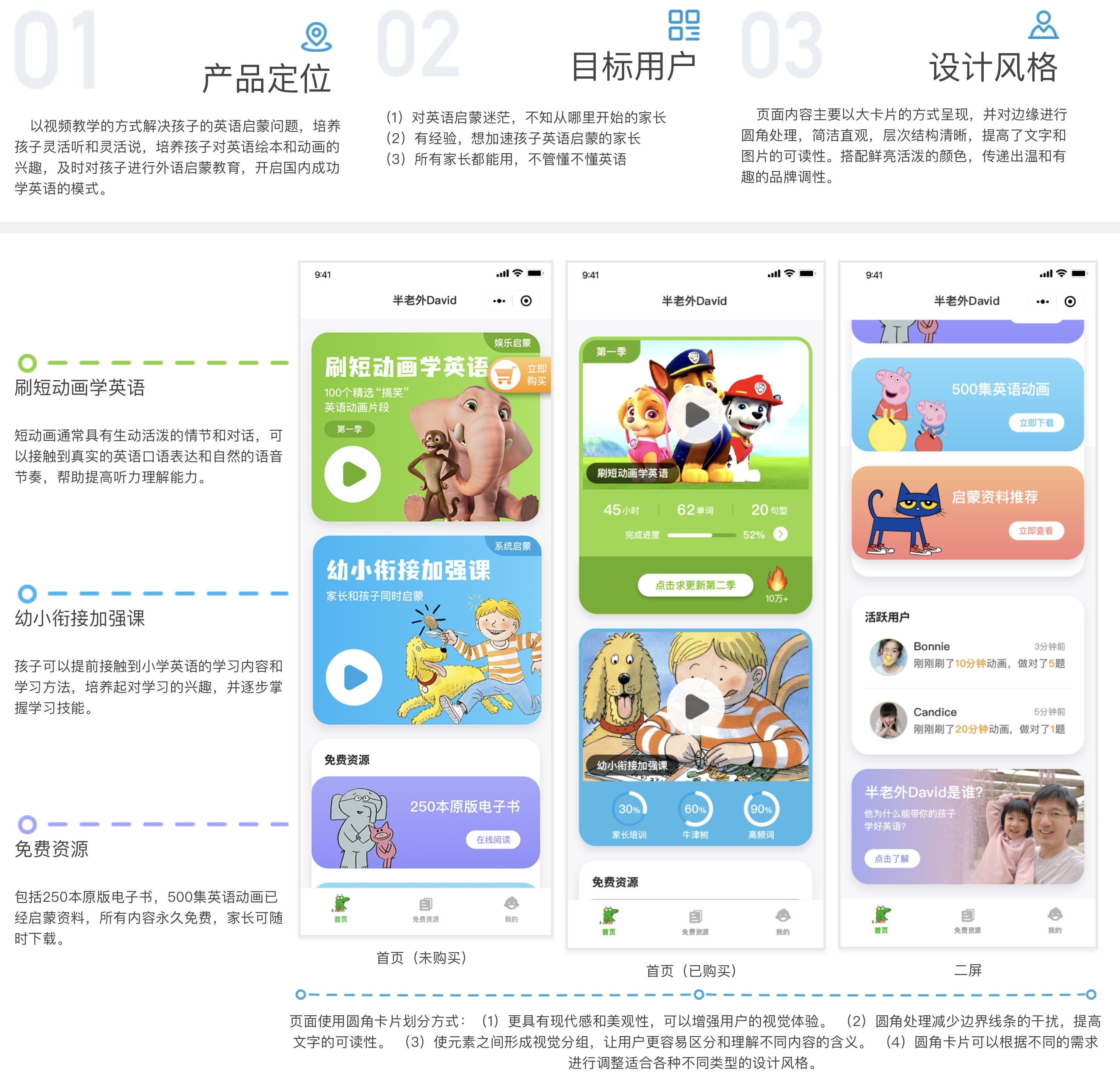 舉例來說,我們曾為一個名為“半老外 David 英語啟蒙”小程序參與界面與交互設計。在這個面向兒童與家長的英語學習產品中,為了提高用戶體驗我們進行視覺調整: