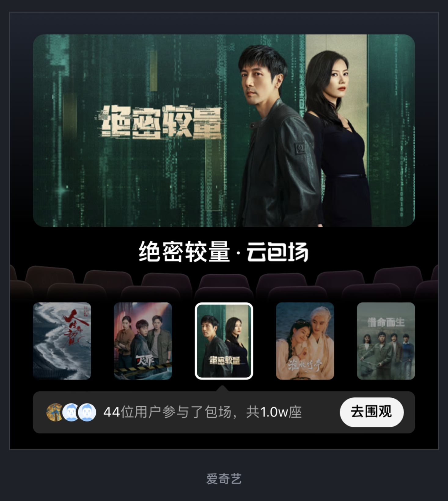 愛奇藝 “云包場” 欄目完美詮釋了這一點:將影院觀影的場景搬到線上,通過模擬影廳座位、觀眾參與人數等元素,讓用戶感受到 “和陌生人一起看電影” 的氛圍感。這種設計不僅讓 “云包場” 功能更直觀,還提升了用戶的參與意愿,讓功能不再是冰冷的按鈕。