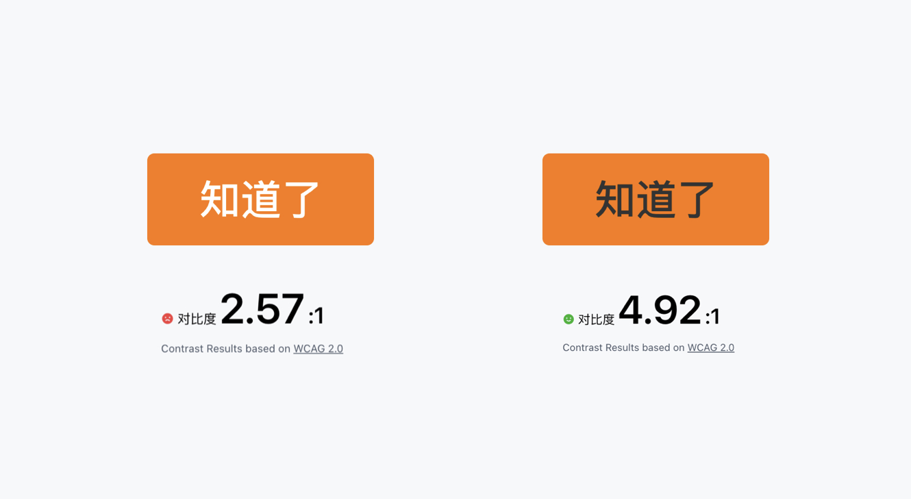 不少設計師將 WCAG 對比度數值奉為圭臬,認為未達標的設計就是不合格的。但實際場景中,算法計算與用戶真實感知往往存在偏差。例如兩個橙色背景的按鈕,黑色文本對比度 4.92:1(符合標準),白色文本僅 2.57:1(未達標準),可多數用戶(包括色盲群體)卻反饋白色文本更易閱讀。這是因為淺色背景與白色文本的視覺融合度更高,亮度感知的舒適度并非單一對比度數值能定義。